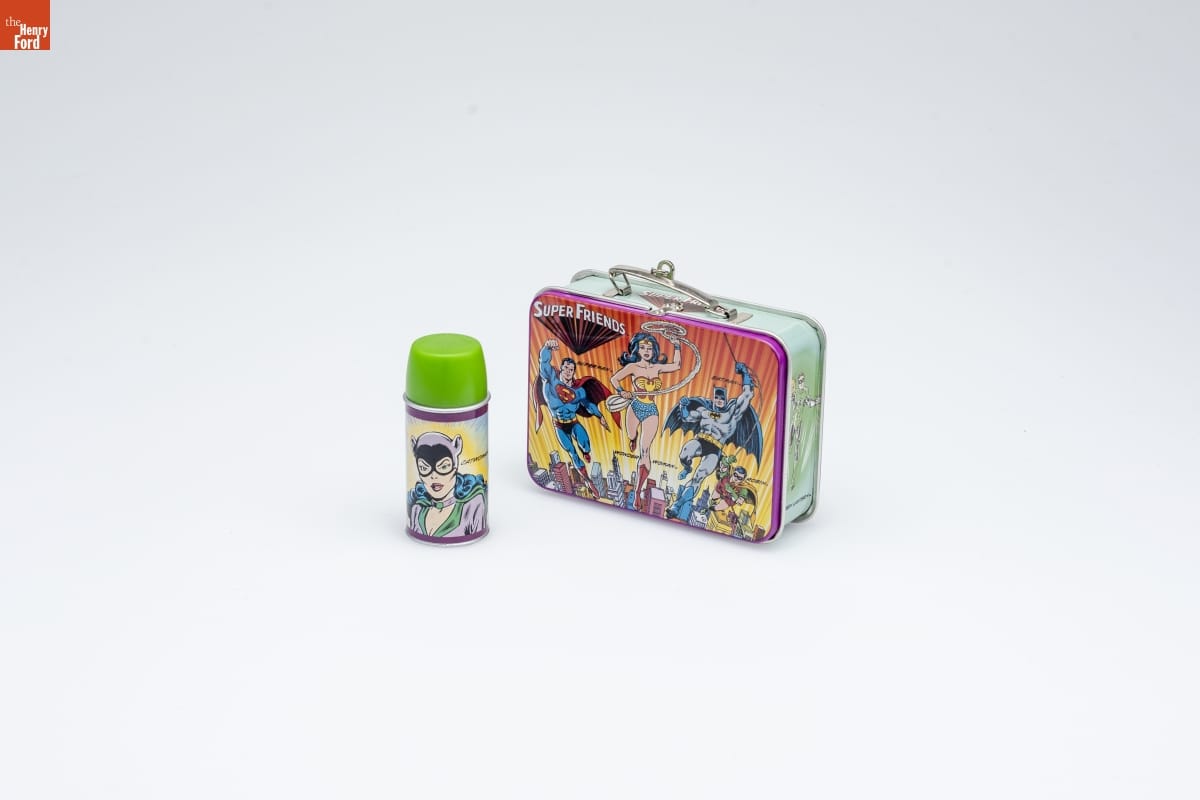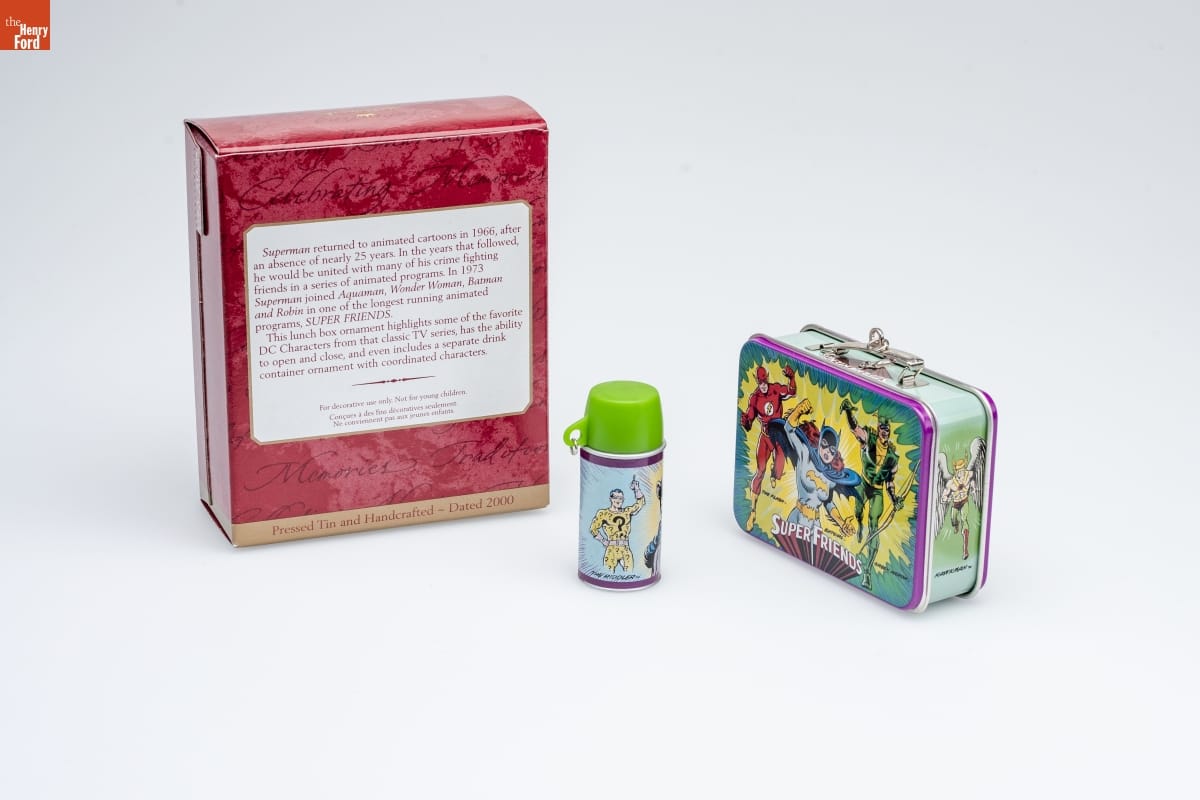 Superman returned to animated cartoons in 1966, after / an absence of nearly 25 years. In the years that followed, / he would be united with many of his crime fighting / friends in a series of animated programs. In 1973 / Superman joined Aquaman, Wonder Woman, Batman / and Robin in one of the longest running animated / programs, SUPER FRIENDS. / This lunch box ornament highlights some of the favorites / to open and close, and even includes a separate drink / container ornament with coordinated characters. / For decorative use only. Not for young children. / Concue a des fins decoratives seulement. / Ne convient pas aux jeunes enfants. / Pressed Tin and Handcrafted - Dated 2000