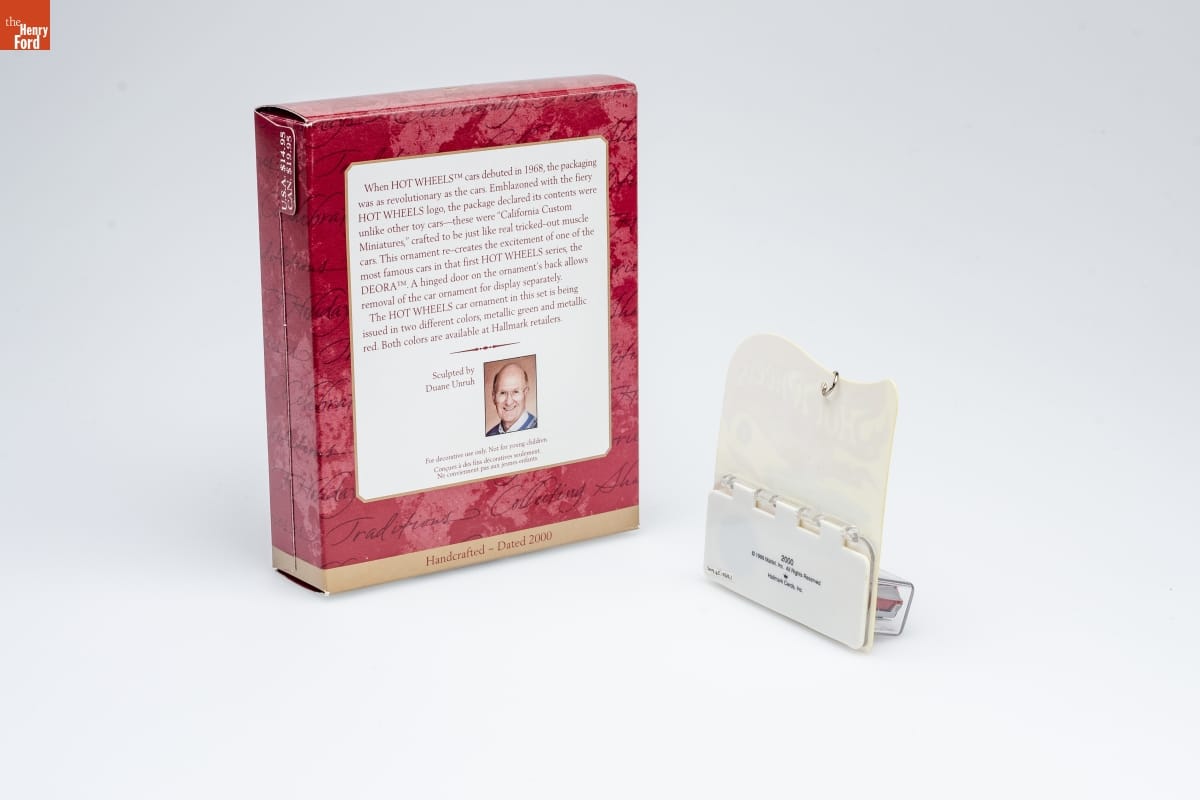 When HOT WHEELS cars debuted in 1968, the packaging / was a revolutionary as the cars. Emblazoned with the fiery / HOT WHEELS logo, the package declared its contents were / unlike other toy cars-these were "California Custom / Miniatures," crafted to be just like real tricked-out muscle / cars. This ornament re-creates the excitement of one of the / most famous cars in that first HOT WHEELS series, the / DEORA. A hinged door on the ornament's back allows / removal of the car ornament for display separately. / The HOT WHEELS car ornament in this set is being / issued in two different colors, metallic green and metallic / red. Both colors are available at Hallmark retailers. / Sculpted / Duane Unruh / For decorative use only. Not for young children. / Concue a des fins decoratives seulement. / Ne convient pas aux jeunes enfants. / Handcrafted - Dated 2000