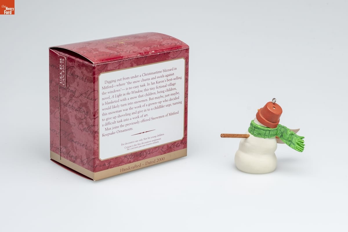 Digging out from under a Christmastime blizzard in / Mitford--where "the snow churns and swirls against / the windows"--is no easy task. In Jan Karon's best-selling / novel, A Light in the Window, this tiny fictional village / is blanketed with a snow that children, being children, / would likely turn into snowmen. But maybe, just maybe, / this snowman was the work of a grown-up who decided / to give up shoveling and give in to a childlike urge, turning / a difficult task into a work of art. / Max joins the previously offered Snowmen of Mitford / Keepsake Ornaments. / For decorative use only. Not for young children. / Concue a des fins decoratives seulement. / Ne convient pas aux jeunes enfants. / Handcrafted - Dated 2000