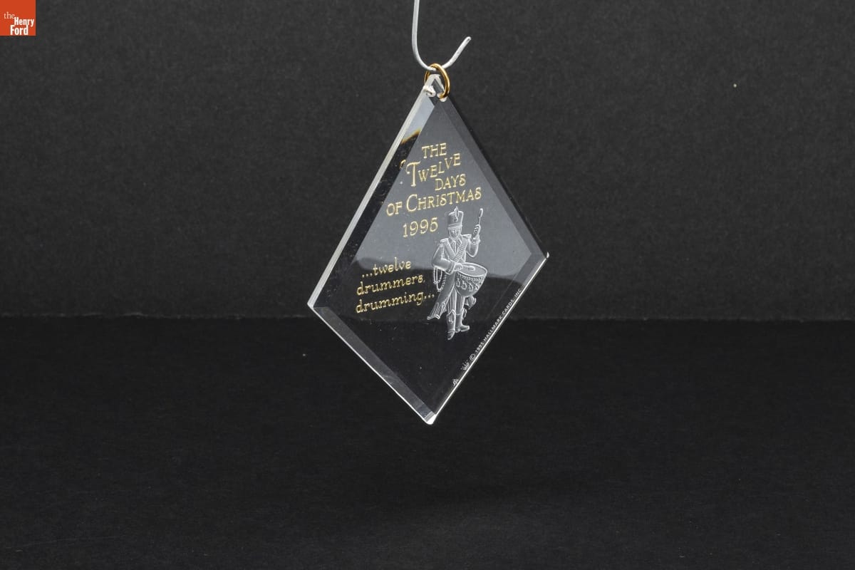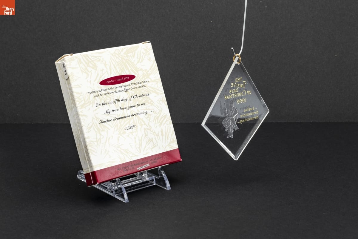 Acrylic - Dated 1995 / Twelfth and Final in the Twelve Days of Christmas Series. / Look for series verification 12 on this ornament. / On the twelfth day of Christmas / My true love gave to me / Twelve drummers drumming... / Mfd. for and (C) 1995 Hallmark Cards, Inc., K.C., MO 64141 / Made in U.S.A. QX3009