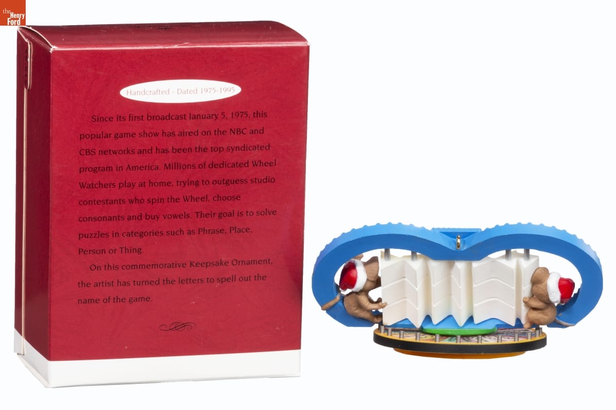 Handcrafted - Dated 1975-1995 / Since its first broadcast January 5, 1975, this / popular game show has aired on the NBC and / CBS networks and has been the top syndicated / program in America. Millions of dedicated Wheel / Watchers play at home, trying to outguess studio / contestants who spin the Wheel, choose / consonants and buy vowels. Their goal is to solve / puzzles in categories such as Phrase, Place, / Person or Thing. / On this commemorative Keepsake Ornament, / the artist has turned the letters to spell out the / name of the game.
