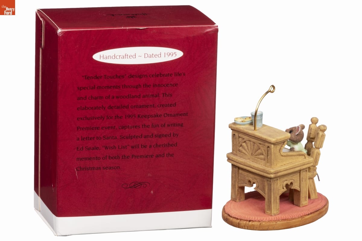 Handcrafted - Dated 1995 / "Tender Touches" designs celebrate life's special moments through the innocence / and charm of a woodland animal. This / elaborately detailed ornament, created / exclusively for the 1995 Keepsake Ornament / Premiere event, captures the fun of writing / a letter to Santa. Sculpted and signed by / Ed Seale, "Wish List" will be a cherished / memento of both the Premiere and the / Christmas season.