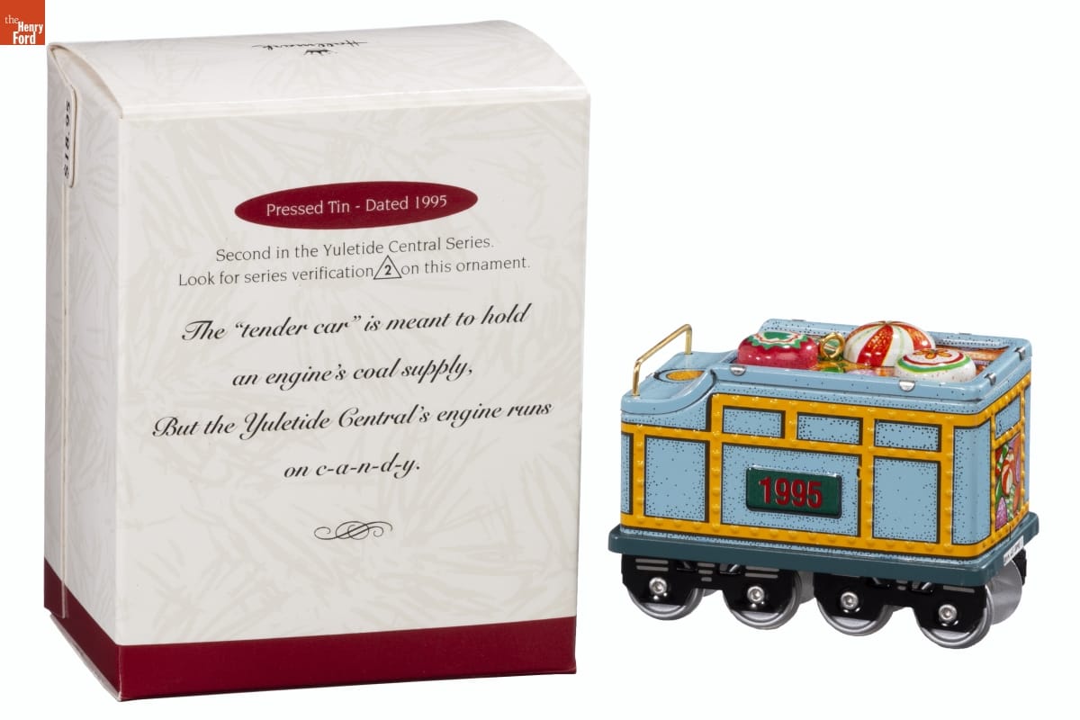 Pressed Tin - Dated 1995 / Second in the Yuletide Central Series. / Look for series verification 2 on this ornament. / The "tender car" is meant to hold / an engine's coal supply. / But the Yuletide Central's engine runs / on c-a-n-d-y.