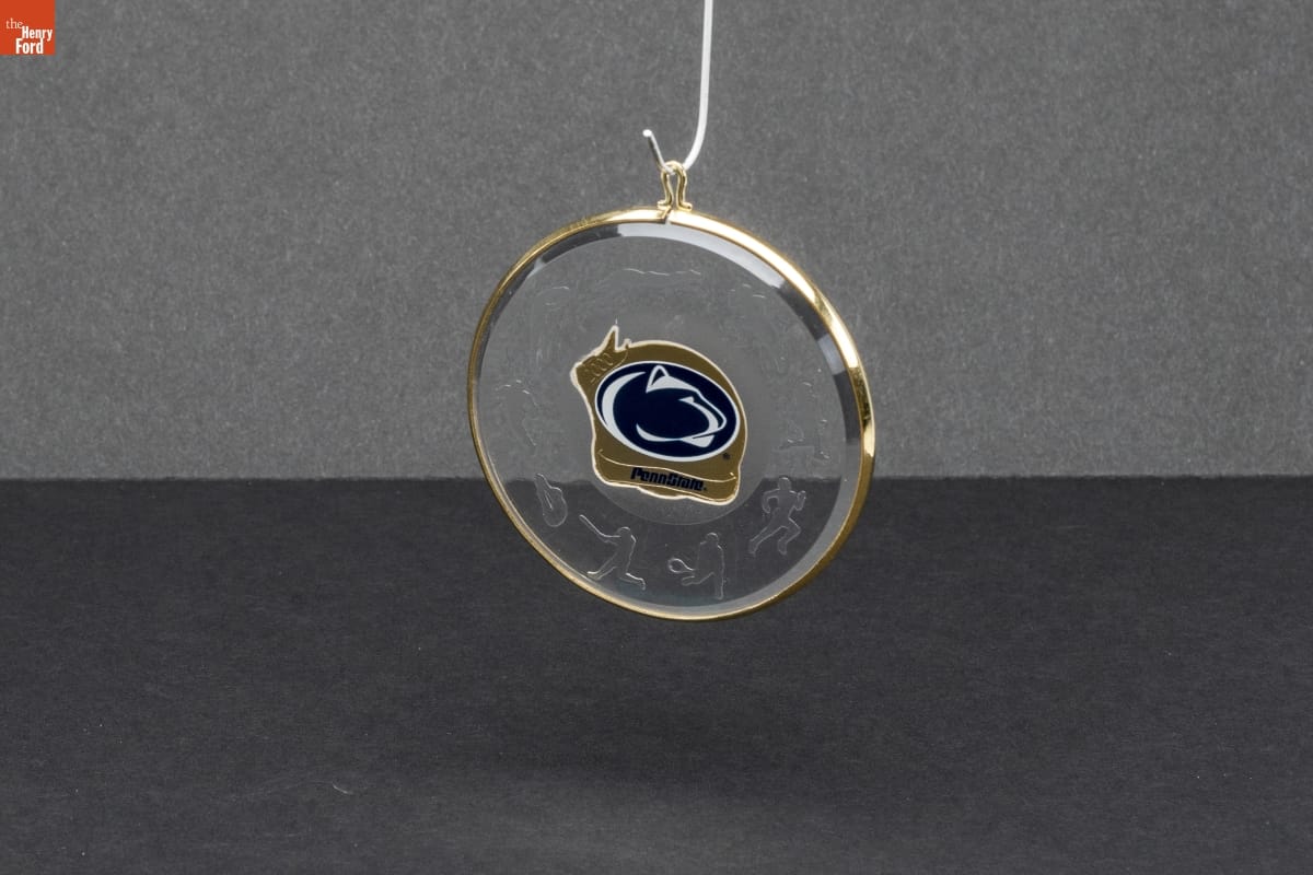 PENN STATE NITTANY LIONS / The University name and logo featured on this product / is a trademark of that University. / Mfd. for/Fabrique pour Hallmark Cards, Inc., Kansas City, MO 64141 / Made in China QSR2311 / For decorative use only. Not for young children. / Concue a des fins decoratives seulement. / Ne convient pas aux jeunes enfants. / Acrylic and Metal - Dated 2000