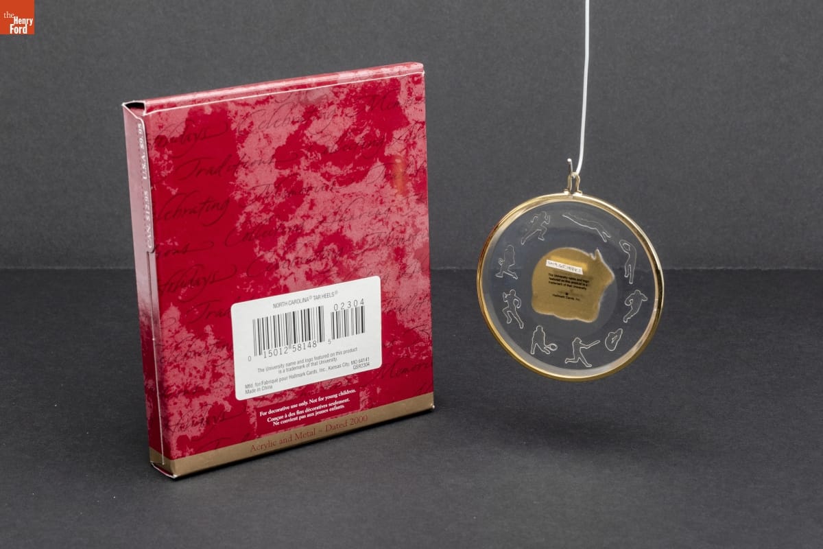 NORTH CAROLINA TAR HEELS / The University name and logo featured on this product / is a trademark of that University. / Mfd. for/Fabrique pour Hallmark Cards, Inc., Kansas City, MO 64141 / Made in China QSR2304 / For decorative use only. Not for young children. / Concue a des fins decoratives seulement. / Ne convient pas aux jeunes enfants. / Acrylic and Metal - Dated 2000