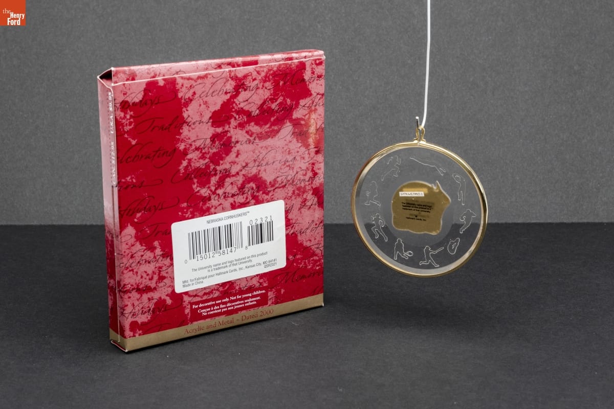 NEBRASKA CORNHUSKERS / The University name and logo featured on this product / is a trademark of that University. / Mfd. for/Fabrique pour Hallmark Cards, Inc., Kansas City, MO 64141 / Made in China QSR2321 / For decorative use only. Not for young children. / Concue a des fins decoratives seulement. / Ne convient pas aux jeunes enfants. / Acrylic and Metal - Dated 2000