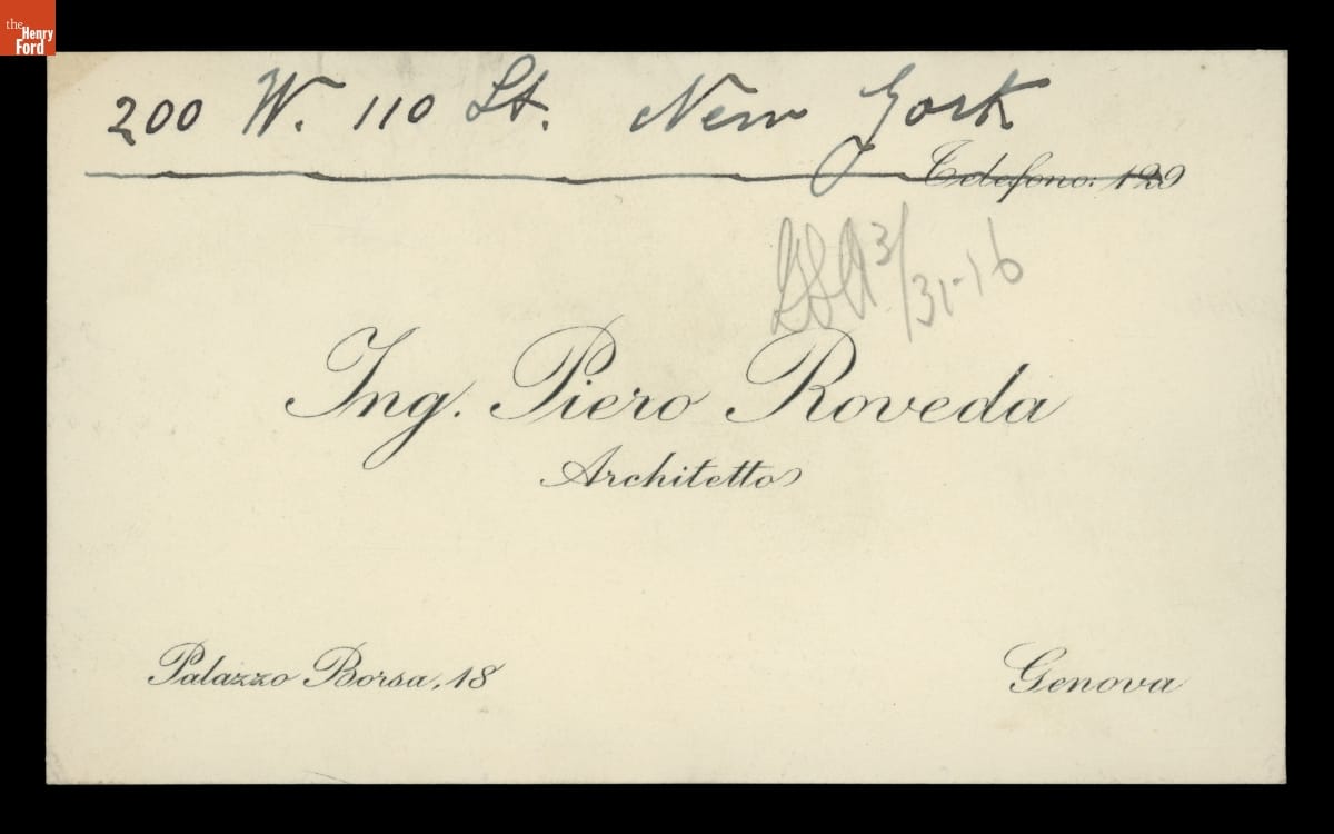 Business Card, Piero [Peter] Roveda Architetto, circa 1916