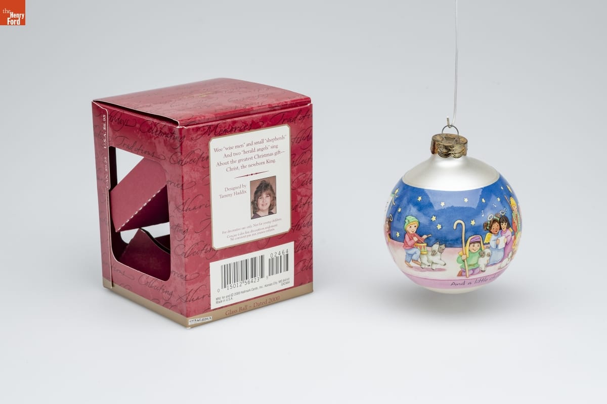 Wee "wise men" and small "shepherds" / And two "herald angels" sing / About the greatest Christmas gift- / Christ, the newborn King. / Designed by / Tammy Haddix / For decorative use only. Not for young children. / Concue a des fins decoratives seulement. / Ne convient pas aux jeunes enfants. / Mfd. for and (C) 2000 Hallmark Cards, Inc., Kansas City, MO 64141 / Made in U.S.A. QX2464 / Glass Ball - Dated 2000