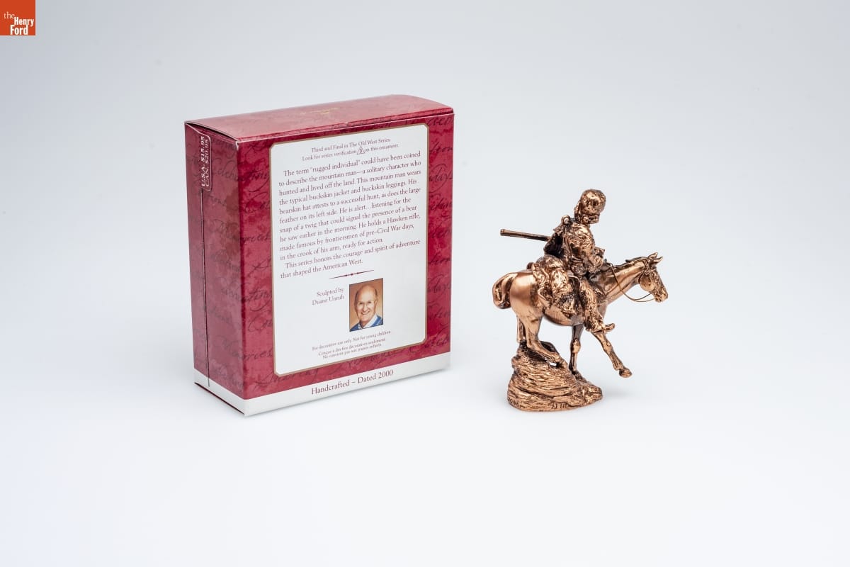 Third and Final in The Old West Series. / Look for series verification 3 on this ornament. / The term "rugged individual" could have been coined / to describe the mountain man--a solitary character who / hunted and lived off the land. This mountain man wears / the typical buckskin jacket and buckskin leggings. His / bearskin hat attests to a successful hunt, as does the large / feather on its left side. He is alert...listening for the / snap of a twig that could signal the presence of a bear / he saw earlier in the morning. He holds a Hawken rifle, / made famous by frontiersmen of pre-Civil War days, / in the crook of his arm, ready for action. / This series honors the courage and spirit of adventure / that shaped the American West. / Sculpted by / Duane Unruh / For decorative use only. Not for young children. / Concue a des fins decoratives seulement. / Ne convient pas aux jeunes enfants. / Handcrafted - Dated 2000