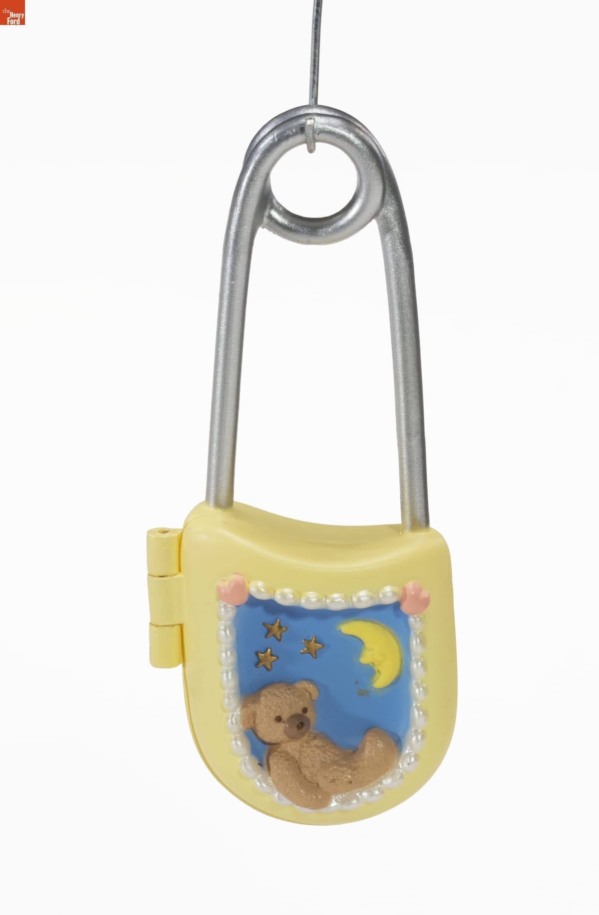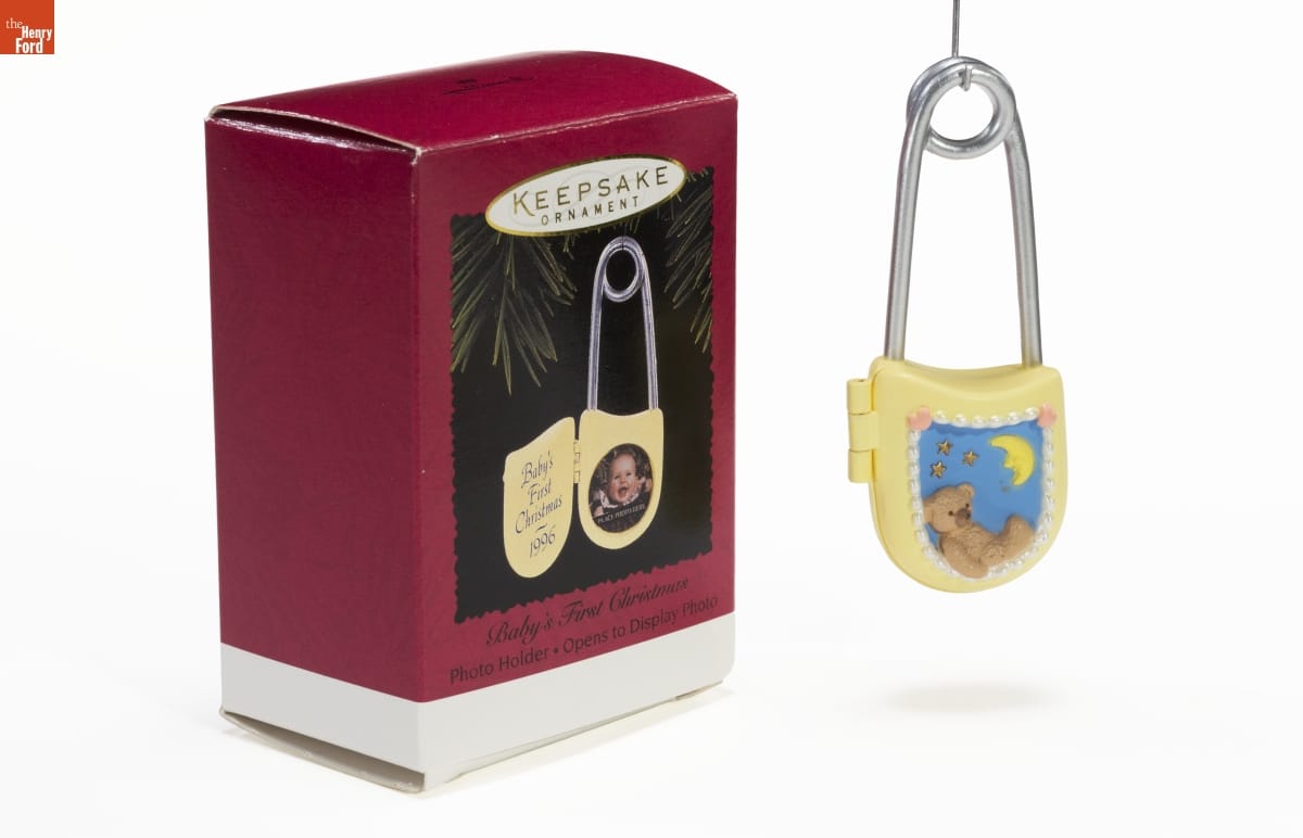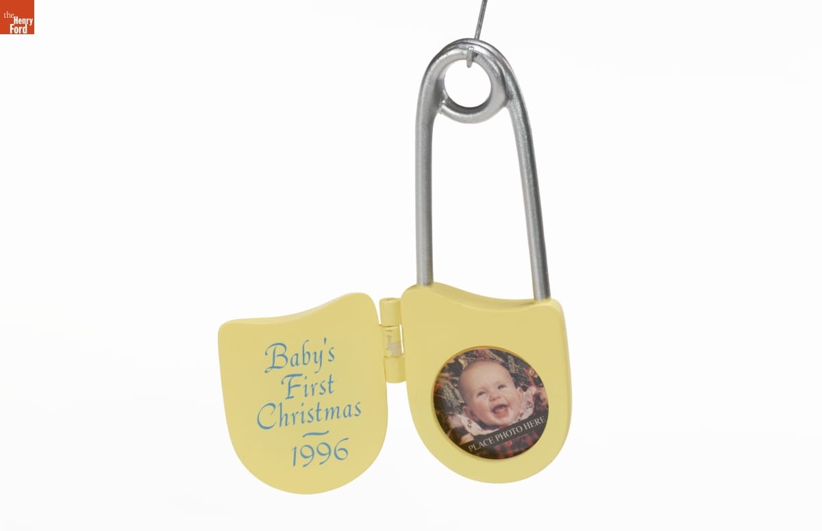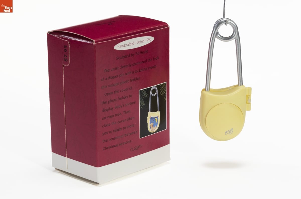 Handcrafted - Dated 1996 / Sculpted by Ed Seale / The artist cleverly combined the look / of a diaper pin with a locket to create / this unique photo holder. / Open the cover of / the photo holder to / display Baby's picture / on your tree. Then / close the cover when / you're ready to store / the ornament between / Christmas seasons.
