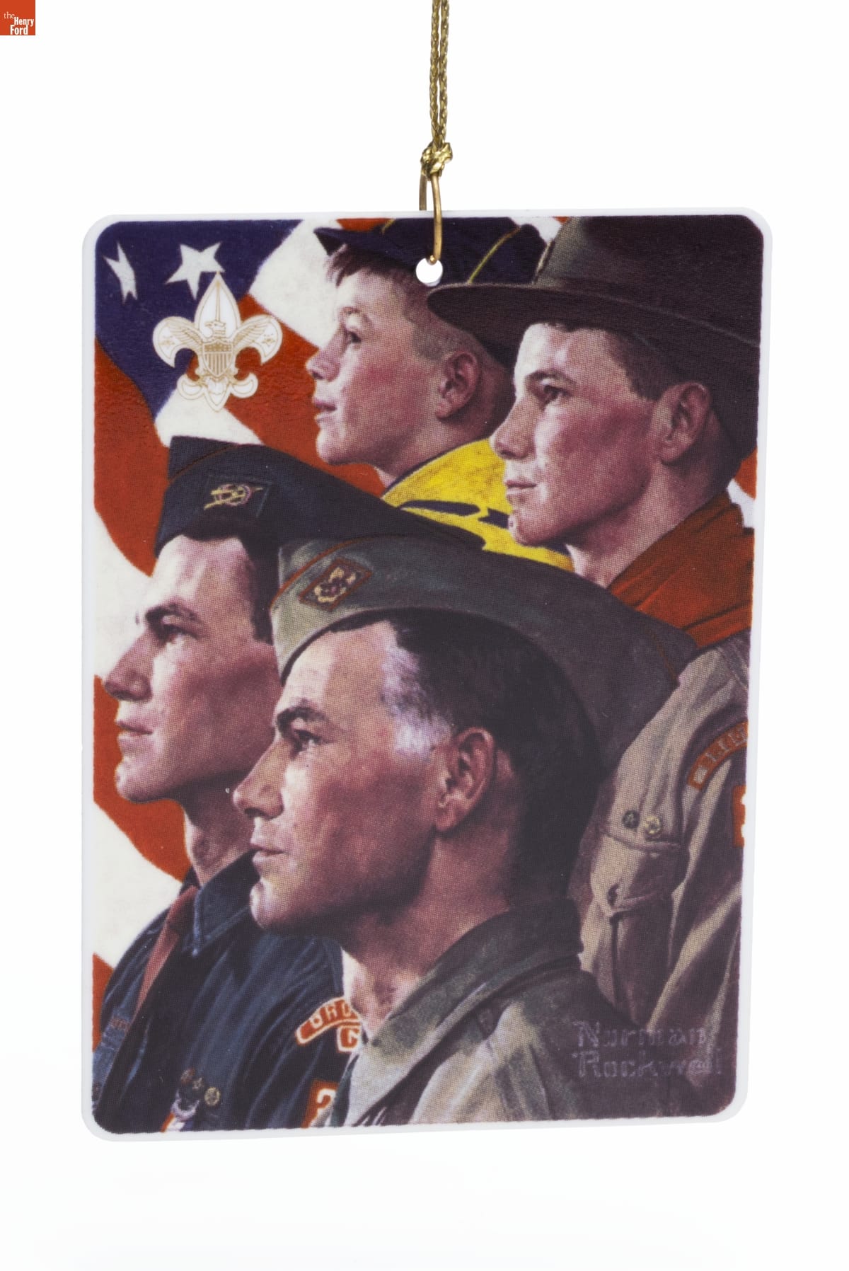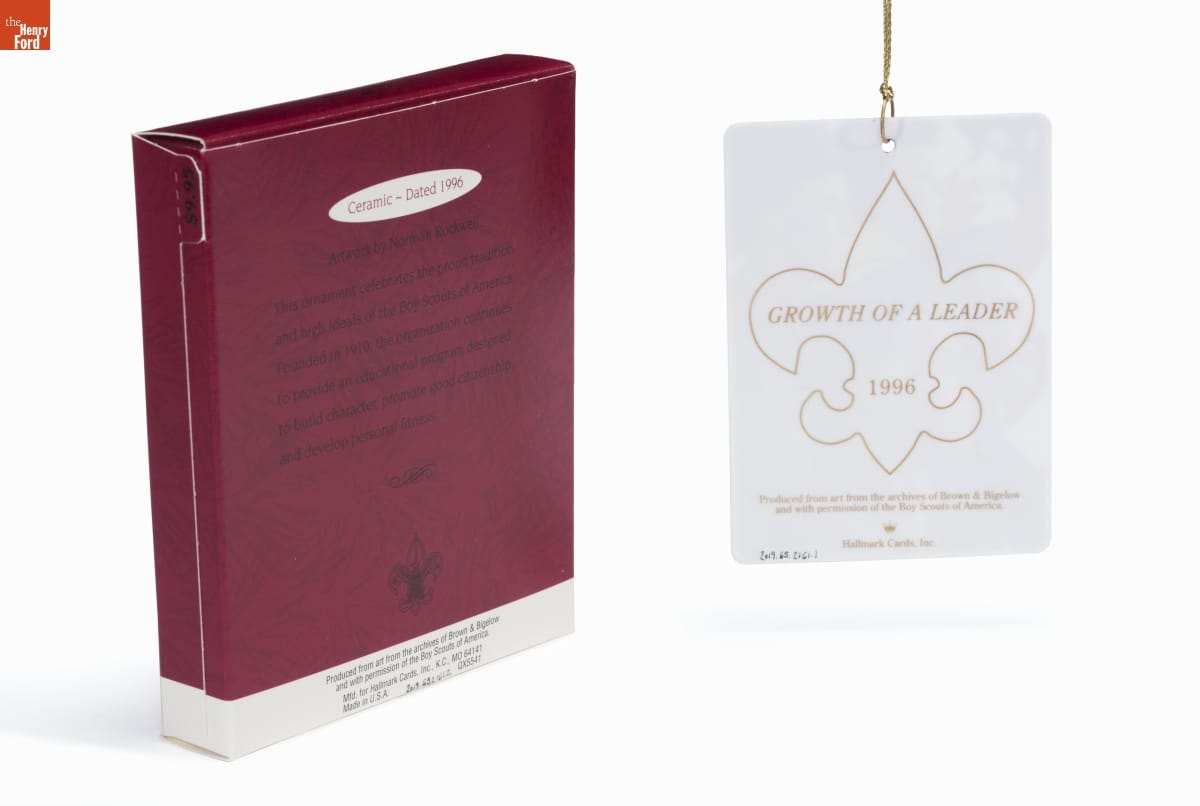 Ceramic - Dated 1996 / Artwork by Norman Rockwell / This ornament celebrates the proud tradition / and high ideals of the Boy Scouts of America. / Founded in 1910, the organization continues to provide an educational program designed to build character, promote good citizenship / and develop personal fitness. / Produced from art from the archives of Brown & Bigelow / and with permission of the Boy Scouts of America. / Mfd. for Hallmark Cards, Inc., K.C., MO 64141 / Made in U.S.A. QX5541