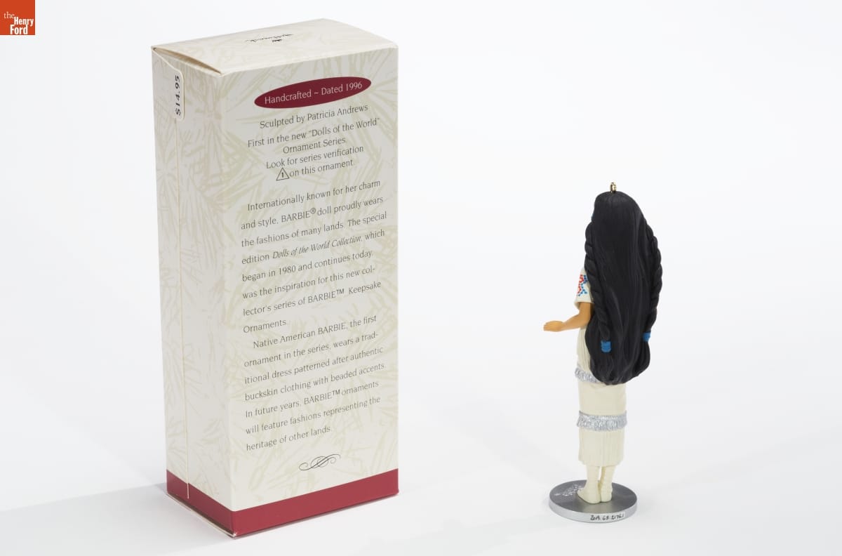 Handcrafted - Dated 1996 / Sculpted by Patricia Andrews / First in the new "Dolls of the World" / Ornament Series. / Look for series verification / 1 on this ornament. / Internationally known for her charm / and style, BARBIE(R) doll proudly wears / the fashions of many lands. The special / edition Dolls of the World Collection which / began in 1980 and continues today / was the inspiration for this new col- / lector's series of BARBIE Keepsake / Ornaments. / Native American BARBIE, the first / ornament in the series wears a trad- / itional dress patterned after authentic / buckskin clothing with beaded accents / in future years. BARBIE ornaments / will feature fashions representing the / heritage of other lands.