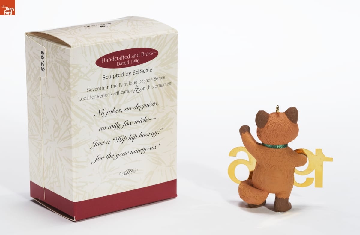 Handcrafted and Brass- / Dated 1996 / Sculpted by Ed Seale / Seventh in the Fabulous Decade Series. / Look for series verification / 7 on this ornament. / No jokes, no disguises, / no wily, fox tricks-- / Just a "Hip hip hooray!" / for the year ninety-six!