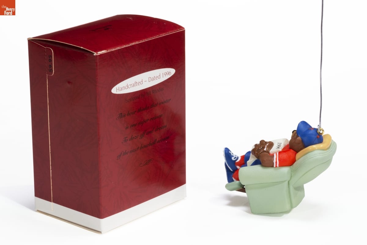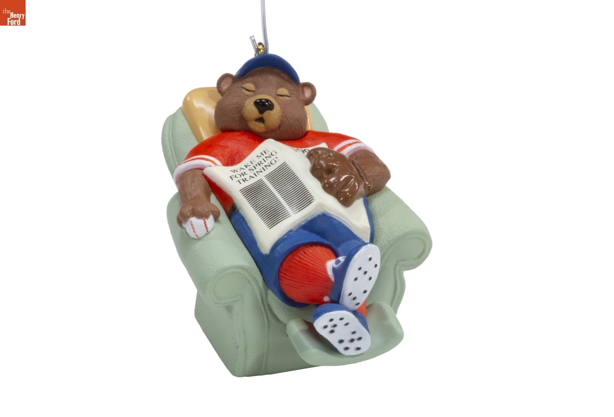Handcrafted - Dated 1996 / Sculpted by Dill Rhodus / This bear thinks that winter / is one super reason / To doze off and dream / of the next baseball season!