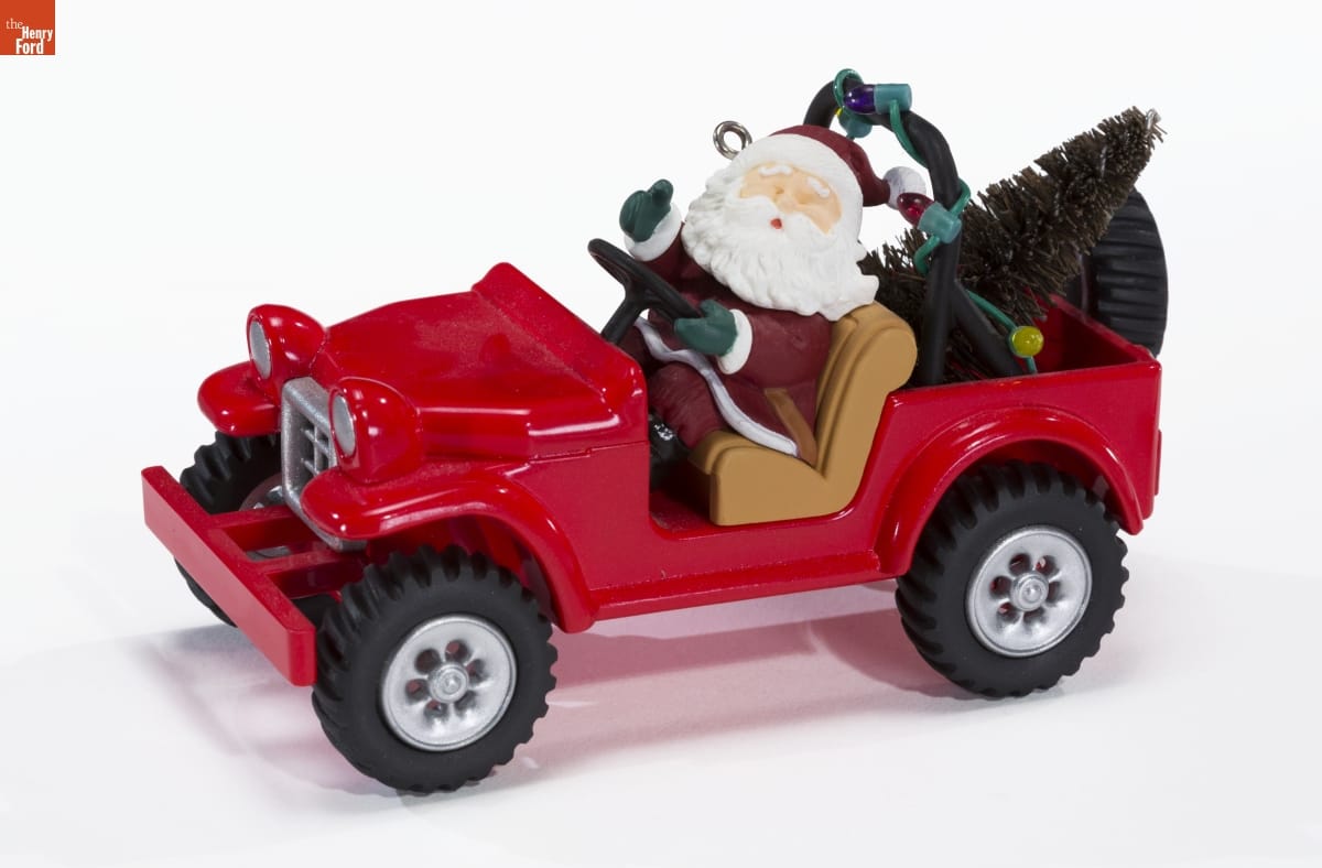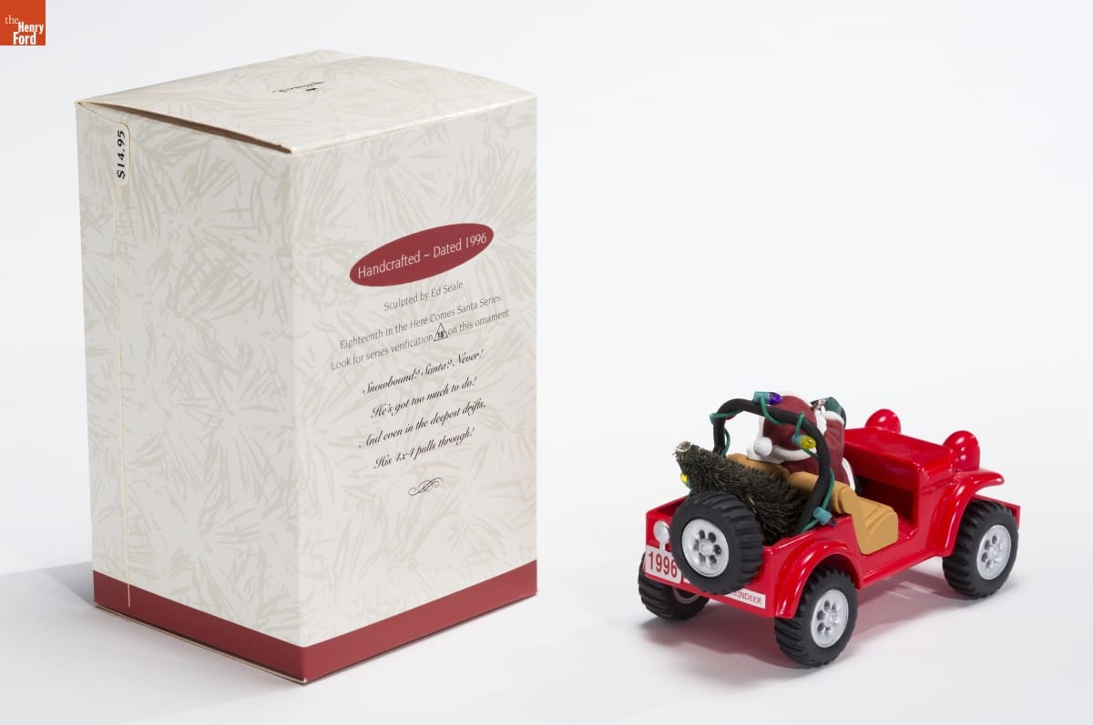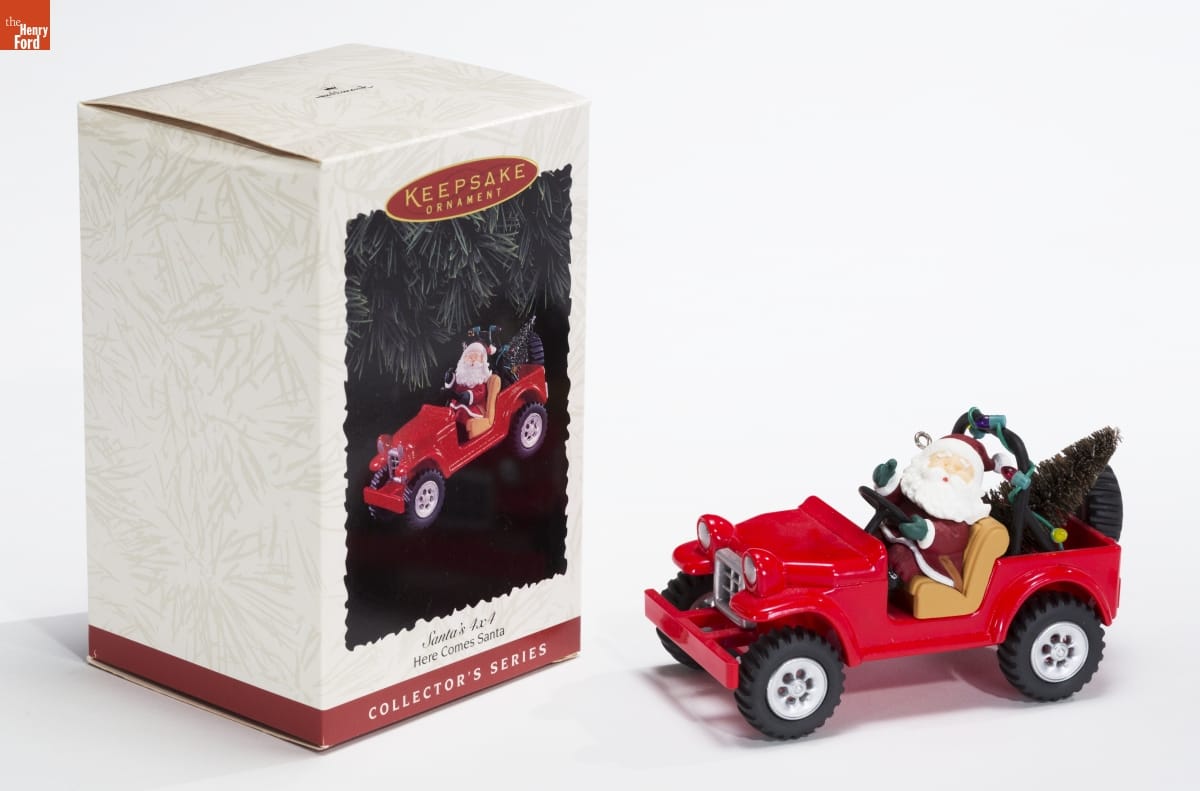 Hallmark's long-running "Here Comes Santa" series featured jolly St. Nick using different forms of transportation. The series began in 1979 depicting Santa driving an antique car. By the time the series ended in 2003, Santa had hopped a ride on a range of vehicles, including a fire truck, golf cart, rocket, snowplow, tractor, trolley, semitruck, and a Soap Box Derby car.