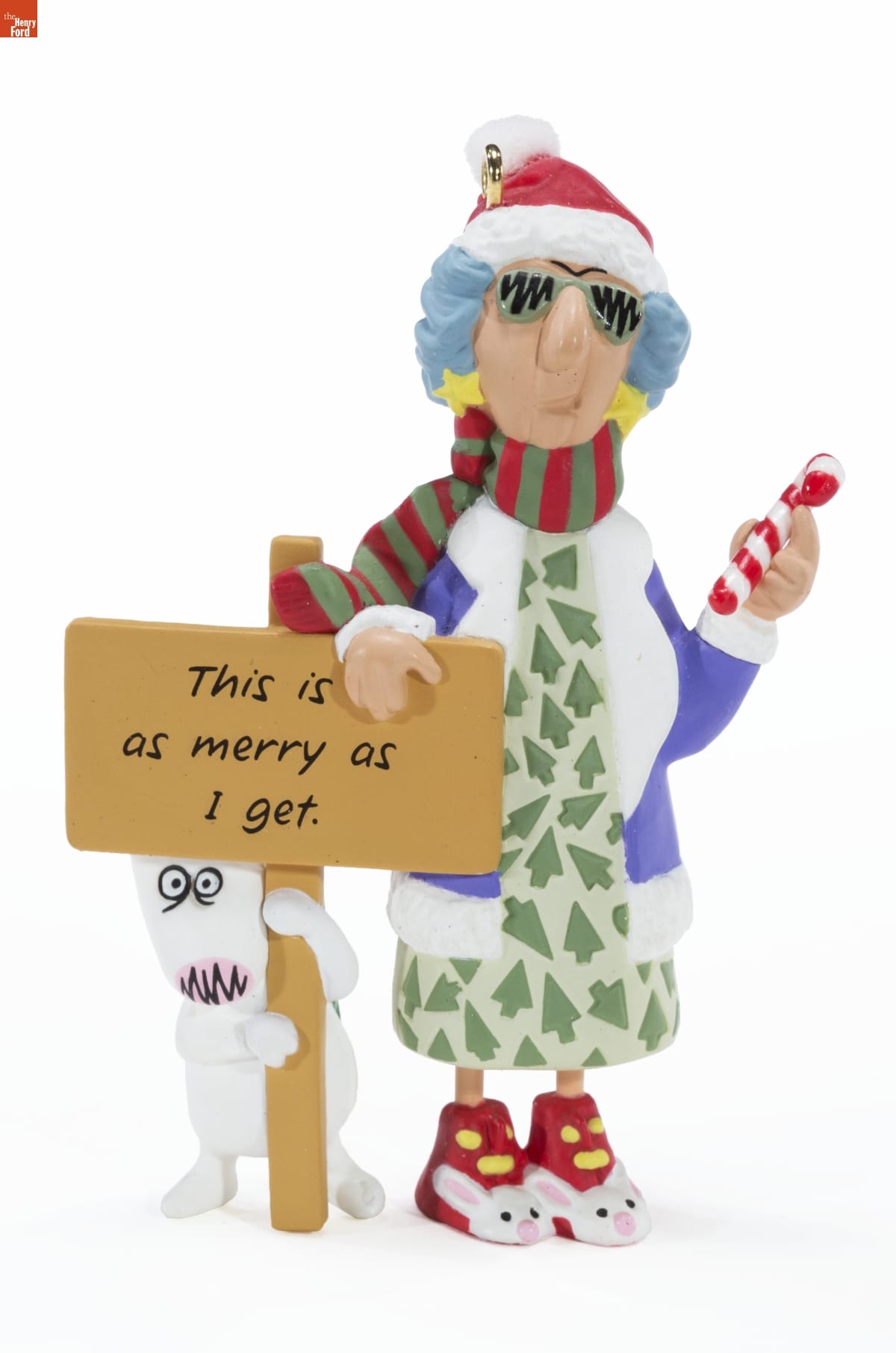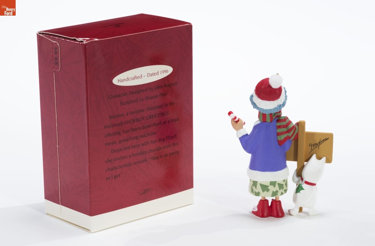 Handcrafted - Dated 1996 / Character Designed by John Wagner / Sculpted by Sharon Pike / Maxine, a favorite character in the / Hallmark SHOEBOX GREETINGS / offering, has been described as a lean, / mean grouching machine. / Depicted here with her dog Floyd, / she invites a holiday chuckle with this / characteristic remark, "This is as merry / as I get."