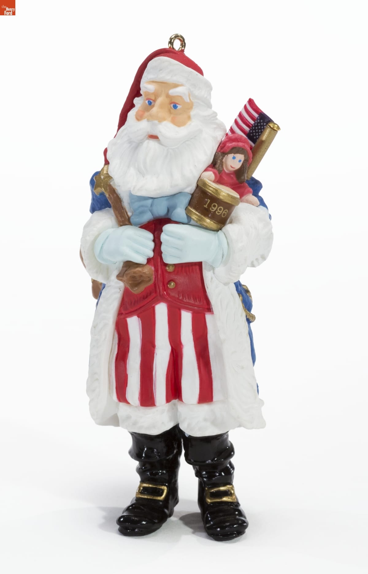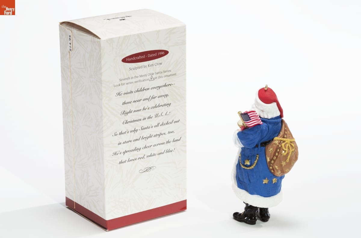 Handcrafted - Dated 1996 / Sculpted by Ken Crow / Seventh in the Merry Olde Santa Series / Look for series verification 7 on this ornament / He visits children everywhere-- / those near and far away. / Right now he's celebrating / Christmas in the U.S.A.! / So that's why Santa's all decked out / in stars and bright stripes, too, / He's spreading cheer across the land / that loves red, white and blue!