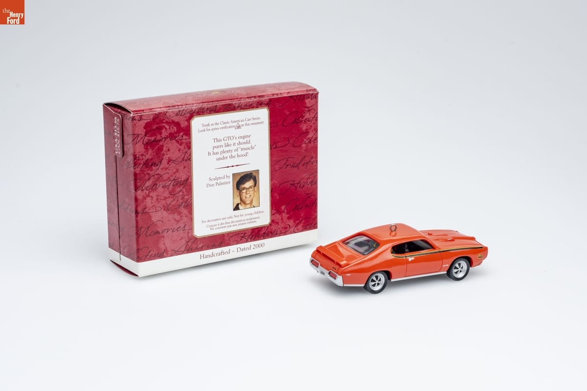 Tenth in the Classic American Cars Series. / Look for series verification 10 on this ornament. / This GTO's engine / purrs like it should. / It has plenty of "muscle" / under the hood! / Sculpted by / Don Palmiter / For decorative use only. Not for young children. / Concue a des fins decoratives seulement. / Ne convient pas aux jeunes enfants. / Handcrafted - Dated 2000