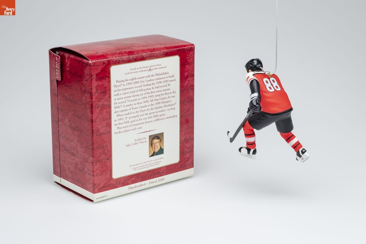 Fourth in the Hockey Greats Series. / Look for series verification 4 on this ornament. / Playing his eighth season with the Philadelphia / Flyers in 1999-2000, Eric Lindros continues to build / on his impressive record. Ending the 1998-1999 season / with a career total of 600 points, he had scored 30 / or more points during six of his first seven seasons. / He scored 70 points in 1994-1995, tying for first in the / NHL. A starter in three NHL All-Star Games, he was / also captain of Team Canada at the 1998 Olympics. / When traded to the Flyers by the Quebec Nordiques / in 1992, "E" promptly put the sport on notice-scoring / his first NHL goal in his very first NHL game. / This series of ornaments honors a different outstanding / hockey player each year. / Sculpted by / John "Collin" Francis / For decorative use only. Not for young children. / Concue a des fins decoratives seulement. / Ne convient pas aux jeunes enfants. / Handcrafted - Dated 2000