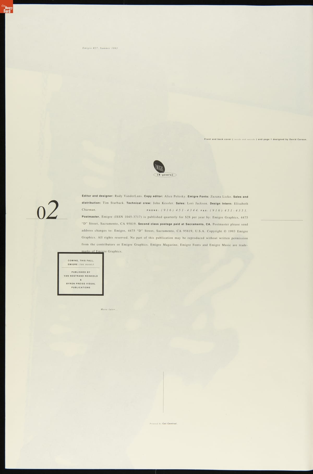 Published by Emigre Graphics, Berkeley, California. Printed at Cal Central, Sacramento, California.