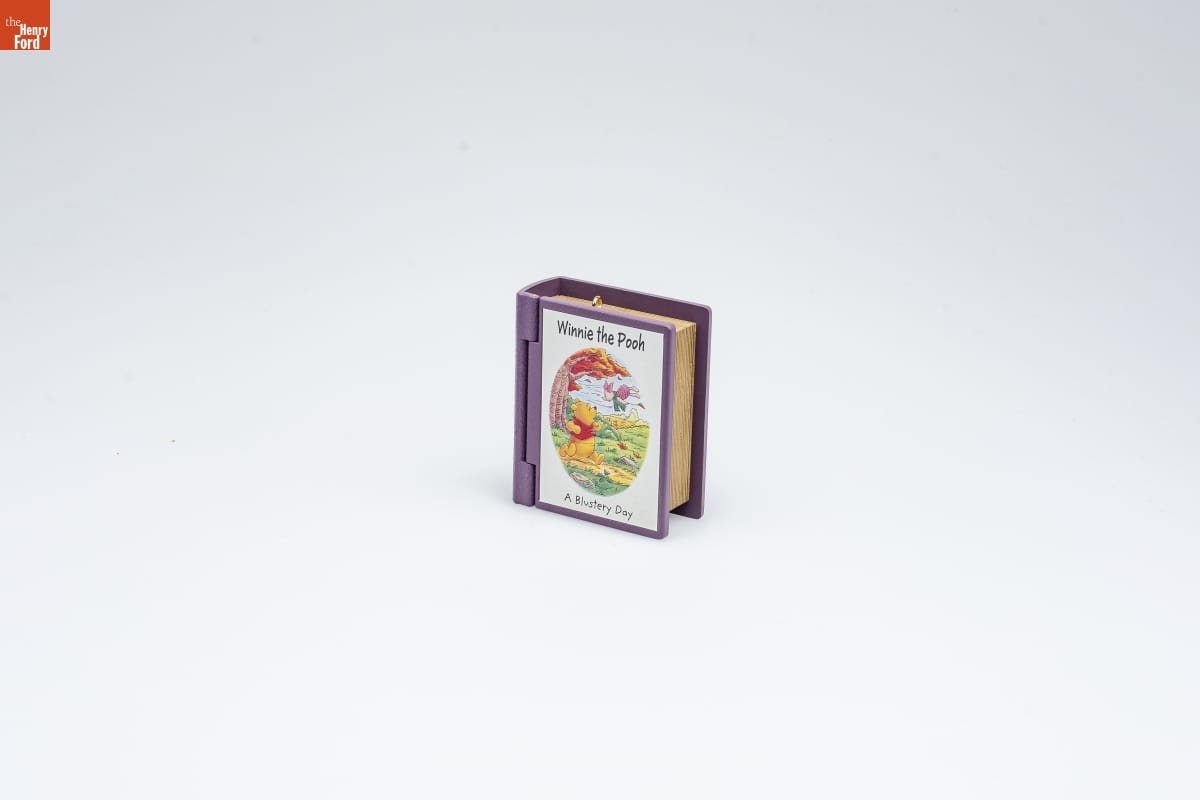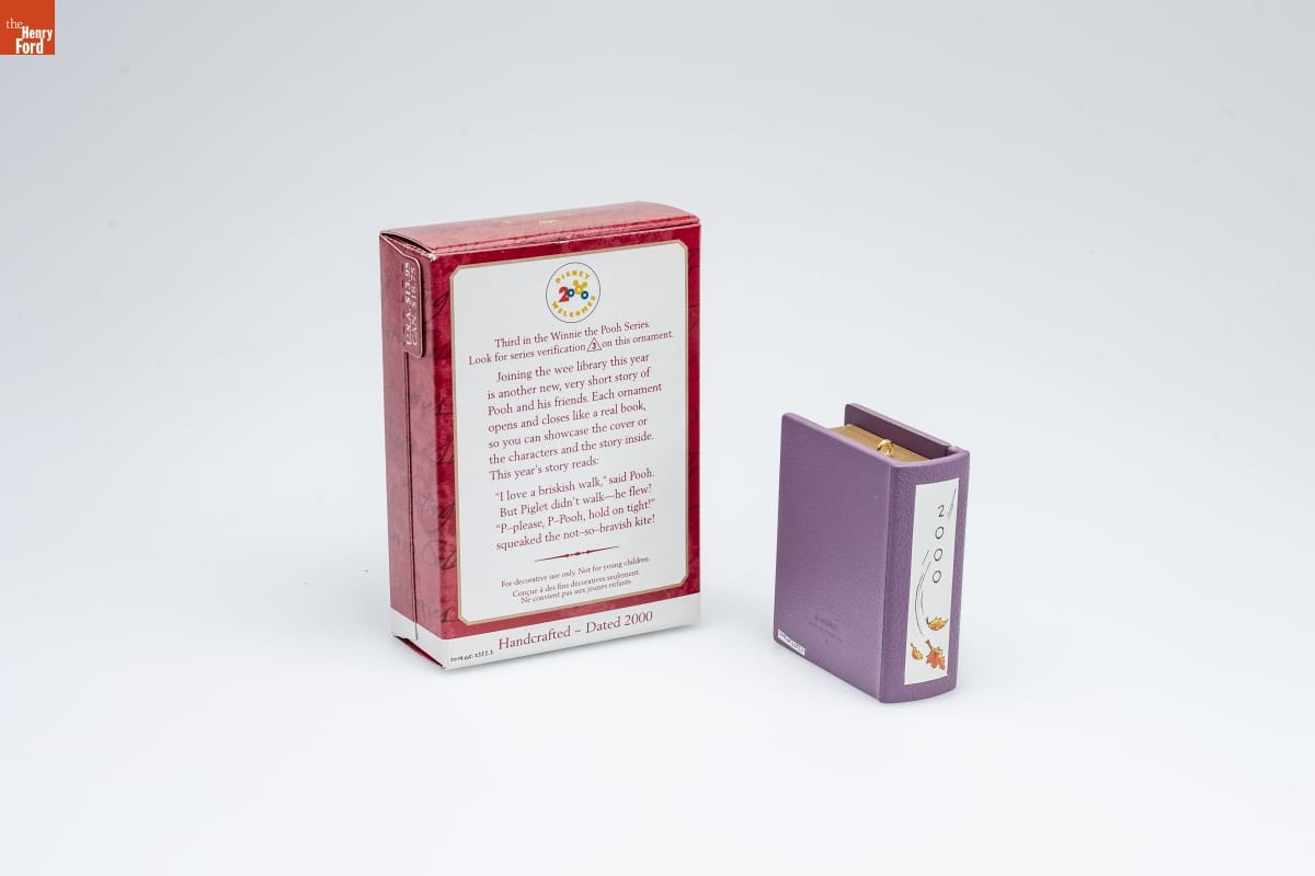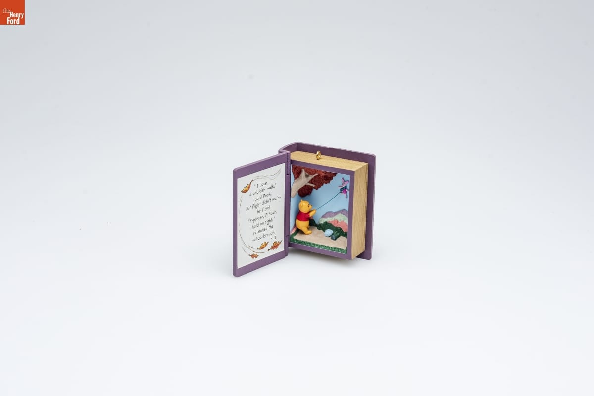 DISNEY / 2000 / WELCOMES / Third in the Winnie the Pooh Series. / Look for series verification 3 on this ornament. / Joining the wee library this year / is another new, very short story of / Pooh and his friends. Each ornament / opens and closes like a real book, / so you can showcase the cover or / the characters and the story inside. / This year's story reads: / "I love a briskish walk," said Pooh. / But Piglet didn't walk-he flew! / "P-please, P-Pooh, hold on tight!" / squeaked the not-so-bravish kite! / For decorative use only. Not for young children. / Concue a des fins decoratives seulement. / Ne convient pas aux jeunes enfants. / Handcrafted - Dated 2000