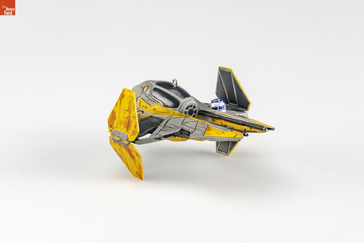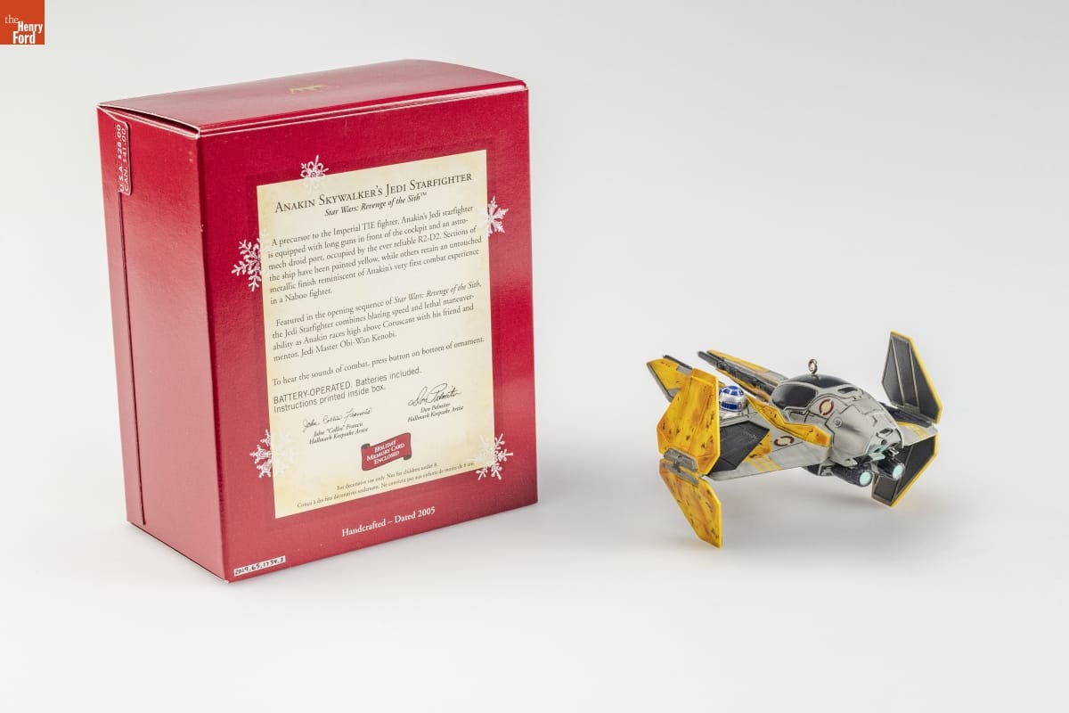 ANAKIN SKYWALKER'S JEDI STARFIGHTER / Star Wars: Revenge of the Sith / A precursor to the Imperial TIE fighter, Anakin's Jedi starfighter is equipped with long guns in front of the cockpit and an astro-mech droid port, occupied by the ever reliable R2-D2. Sections of the ship have been painted yellow, while others retain an untouched metallic finish reminiscent of Anakin's very first combat experience in a Naboo fighter. / Featured in the opening sequence of Star Wars: Revenge of the Sith, the Jedi Starfighter combines blazing speed and lethal maneuverability as Anakin races high above Coruscant with his friend and mentor, Jedi Master Obi-Wan Kenobi. / To hear the sounds of combat, press button on bottom of ornament. / BATTERY-OPERATED. Batteries included. / Instructions printed inside box. / John "Collin" Francis / Hallmark Keepsake Artist / Don Palmiter / Hallmark Keepsake Artist / HOLIDAY / MEMORY CARD / ENCLOSED / For decorative use only. Not for children under 8. / Concu a des fins decoratives seulement. / Ne convient pas aux enfants de moins de 8 ans. / Handcrafted - Dated 2005
