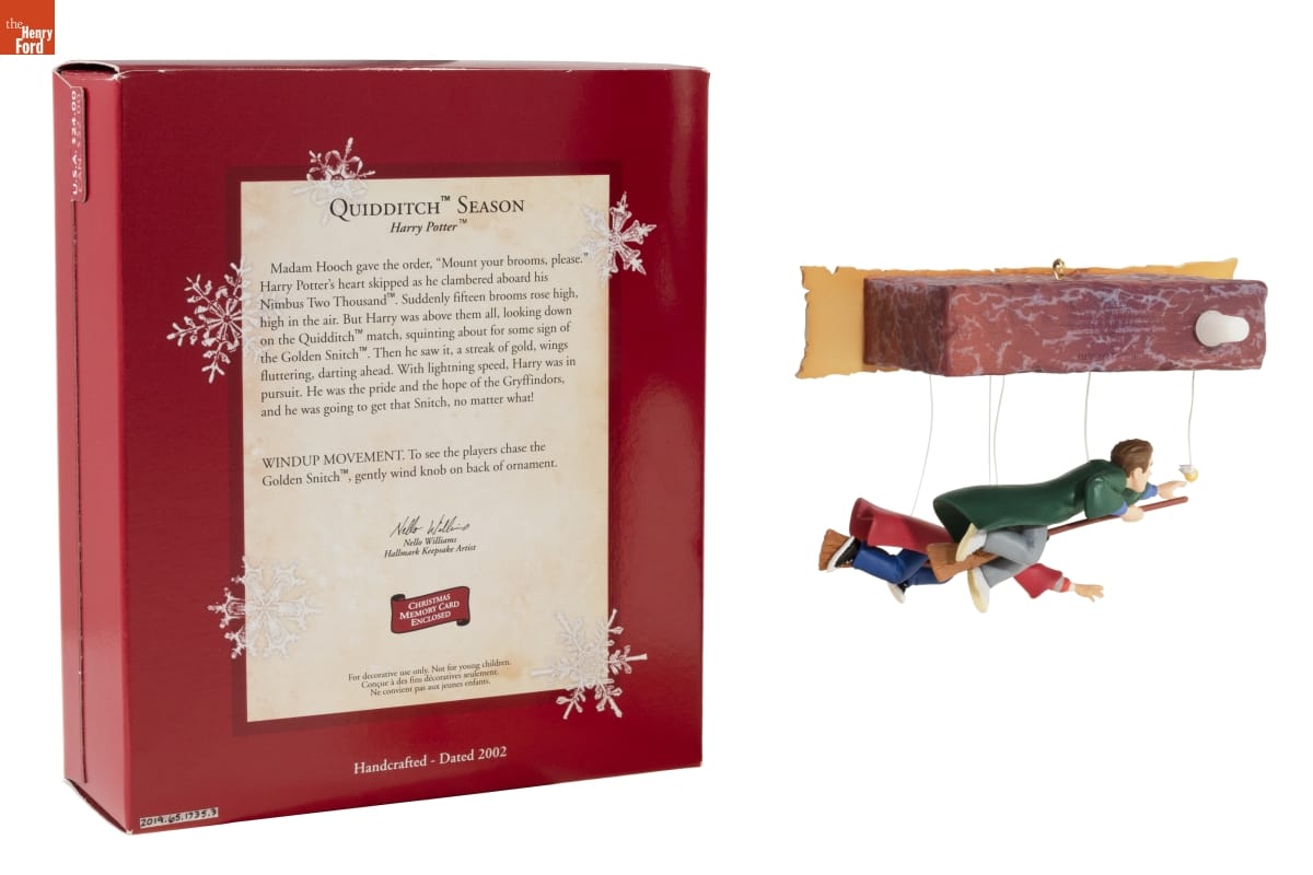 QUIDDITCH SEASON / Harry Potter / Madam Hooch gave the order, "Mount your brooms, please." Harry Potter's heart skipped as he clambered aboard his Nimbus Two Thousand. Suddenly fifteen brooms rose high, high in the air. But Harry was above them all, looking down on the Quidditch match, squinting about for some sign of the Golden Snitch. Then he saw it, a streak of gold, wings fluttering, darting ahead. With lighting speed, Harry was in pursuit. He was the pride and the hope of the Gryffindors, and he was going to get that Snitch, no matter what! / WINDUP MOVEMENT. To see the players chase the Golden Snitch, gently wind knob on back of ornament. / Nello Williams / Hallmark Keepsake Artist / CHRISTMAS / MEMORY CARD / ENCLOSED / For decorative use only. Not for young children. / Concue a des fins decoratives seulement. / Ne convient pas aux jeunes enfants. / Handcrafted - Dated 2002