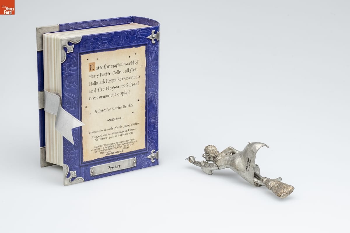 Enter the magical world of / Harry Potter. Collect all five / Hallmark Keepsake Ornaments / and the Hogwarts School / Crest ornament display! / Sculpted by Katrina Bricker / For decorative use only. Not for young children. / Concue a des fins decoratives seulement. / Ne convient pas aux jeunes enfants. / HARRY POTTER characters, names and related indicia / are trademarks of Warner Bros. (C) 2000. www.warnerbros.com / Mfd. for Hallmark Cards, Inc., Kansas City, MO 64141 / Made in China QXE4381 / www.hallmark.com / Pewter