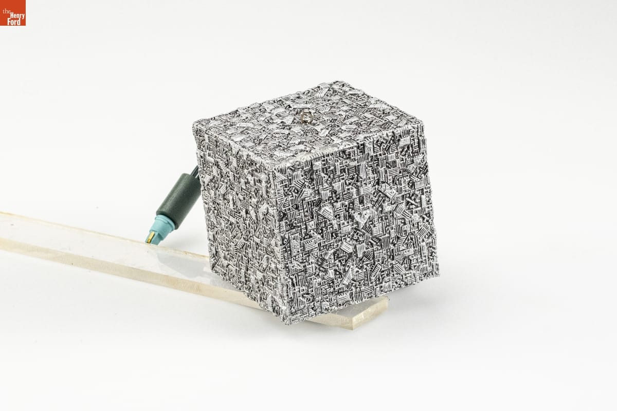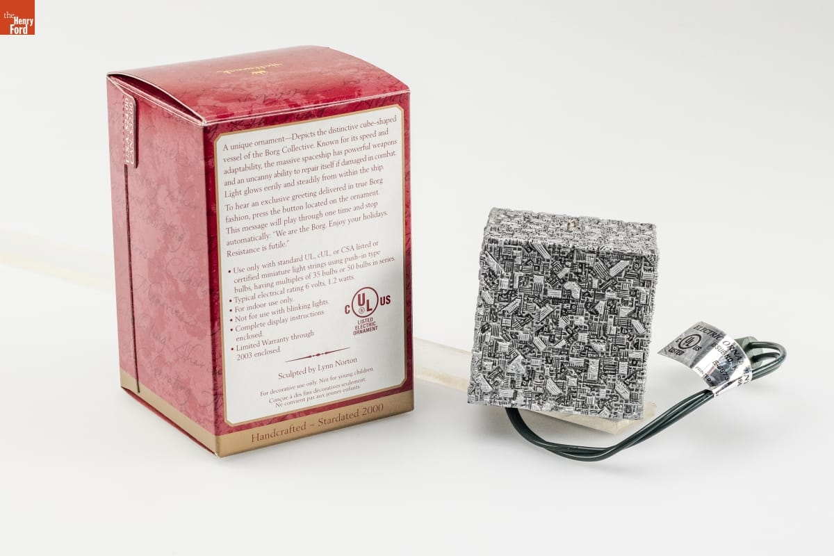 A unique ornament--Depicts the distinctive cube-shaped / vessel of the Borg Collective. Known for its speed and / adaptability, the massive spaceship has powerful weapons / and an uncanny ability to repair itself if damaged in combat. / Light glows eerily and steadily from within the ship. / To hear an exclusive greeting delivered in true Borg / fashion, press the button located on the ornament. / This message will play through one time and stop / automatically: "We are the Borg. Enjoy your holidays. Resistance is futile." / Use only with standard UL, cUL, or CSA listed or / certified miniature light strings using push-in type / bulbs, having multiples of 35 bulbs or 50 bulbs in series. / Typical electrical rating 6 volts, 1.2 watts. / For indoor use only. / Not for use with blinking lights. / Complete display instructions / enclosed / Limited Warranty through / 2003 enclosed. / c UL(R) US / LISTED / ELECTRIC / ORNAMENT / Sculpted by Lynn Norton / For decorative use only. Not for young children. / Concue a des fins decoratives seulement. / Ne convient pas aux jeunes enfants. / Handcrafted - Stardated 2000