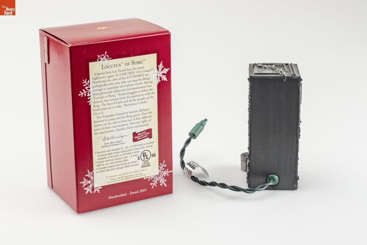 LOCUTUS OF BORG / Captain Jean-Luc Picard faces his worst / nightmare-again. In STAR TREK: First Contact(TM) / Picard and the crew of the ENTERPRISE are / perhaps the only ones who can stop the Borg's / attempt to assimilate all of planet Earth. Having / been previously abducted and transformed into / "Locutus of Borg," Picard struggles to defeat the / demons that remain from his experiences with the / Borg. The fate of Earth and all the peoples of the / Federation are at stake. "Resistance is futile." / Or is it? / This Keepsake Ornament features dialogue / between Locutus and the Borg queen. Press the / button on the side to hear one of four different / part of their conversations. The eerie lights of / the regeneration chamber flash continuously. / Anita Marra Rogers / Anita Marra Rogers / Hallmark Keepsake Artist / HOLIDAY / MEMORY CARD / ENCLOSED / Use only with standard UL, cUL, or CSA listed or certified / miniature light strings using push-in type bulbs, having / multiples of 35 bulbs or 50 bulbs in series. / Typical electrical rating 6 volts, 1.2 watts. / Not for use with blinking lights. / Complete display instructions enclosed. / Limited Warranty through 2008 enclosed. / C UL(R) US / LISTED / ELECTRIC / ORNAMENT / For decorative use only. Not for children under 8. / Concue a des fins decoratives seulement. / Ne convient pas aux enfants de moins de 8 ans. / Handcrafted - Dated 2005