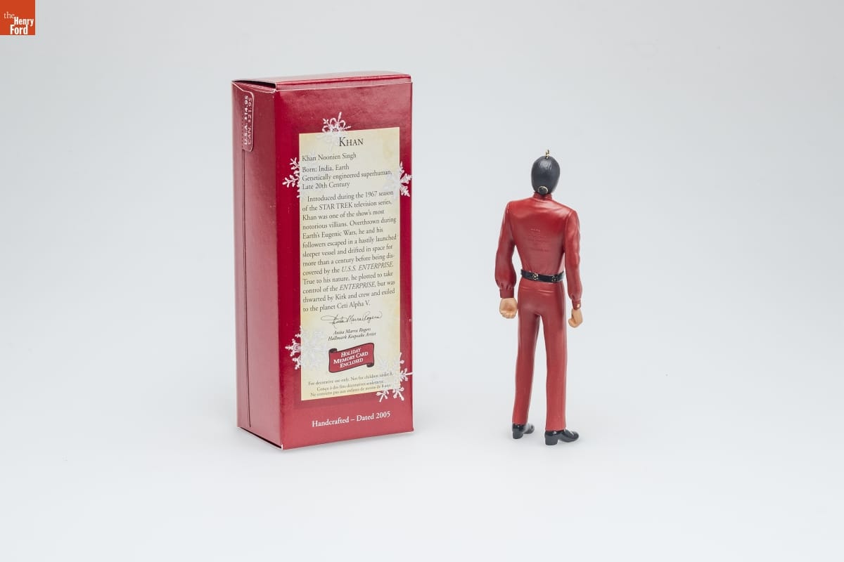 KHAN / Khan Noonien Singh / Born: India, Earth / Genetically engineered superhuman / Late 20th Century / Introduced during the 1967 season / of the STAR TREK television series, Khan was one of the show's most / notorious villians. Overthrown during / Earth's Eugenic Wars, he and his / followers escaped in a hastily launched / sleeper vessel and drifted in space for / more than a century before being dis- / covered by the U.S.S. ENTERPRISE. / True to his nature, he plotted to take / control of the ENTERPRISE, but was / thwarted by Kirk and crew and exiled / to the planet Ceti Alpha V. / Anita Marra Rogers / Anita Marra Rogers / Hallmark Keepsake Artist / HOLIDAY / MEMORY CARD / ENCLOSED / For decorative use only. Not for children under 8. / Concue a des fins decoratives seulement. / Ne convient pas aux enfants de moins de 8 ans. / Handcrafted - Dated 2005