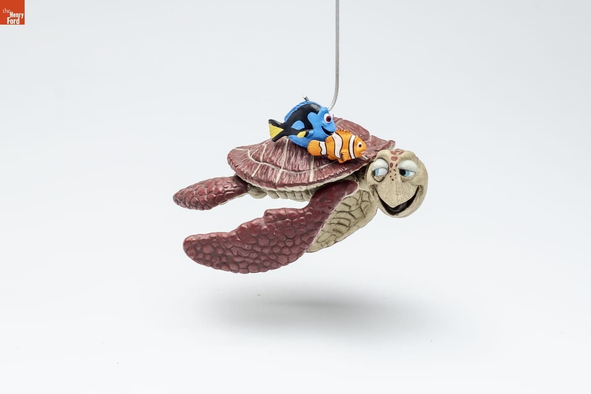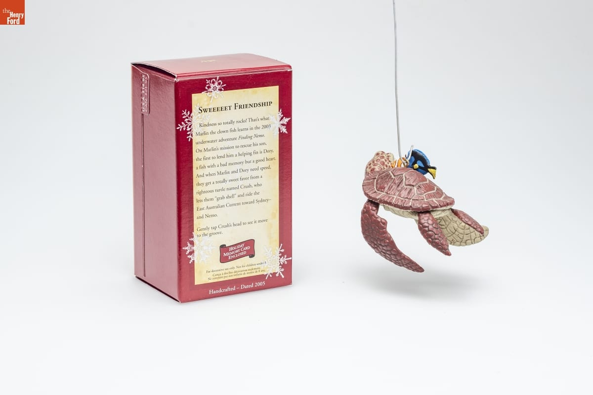 SWEEEEET FRIENDSHIP / Kindness so totally rocks! That's what / Marlin the clown fish learns in the 2003 / underwater adventure Finding Nemo. / On Marlin's mission to rescue his son, / the first to lend him a helping fin is Dory, / a fish with a bad memory but a good heart. / And when Marlin and Dory need speed, / they get a totally sweet favor from a / righteous turtle named Crush, who / lets them "grab shell" and ride the / East Australian Current toward Sydney- / and Nemo. / Gently tap Crush's head to see it move / to the groove. / HOLIDAY / MEMORY CARD / ENCLOSED / For decorative use only. Not for children under 8. / Concue a des fins decoratives seulement. / Ne convient pas aux enfants de moins de 8 ans. / Handcrafted - Dated 2005