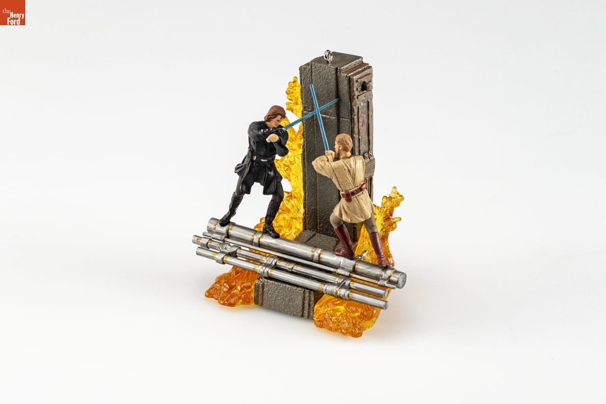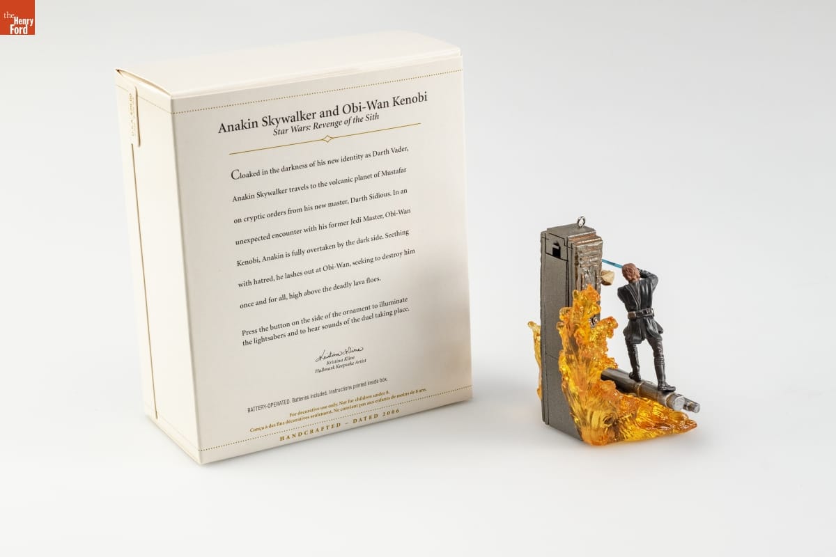Anakin Skywalker and Obi-Wan Kenobi / Star Wars: Revenge of the Sith / Cloaked in the darkness of his new identity as Darth Vader, / Anakin Skywalker travels to the volcanic planet of Mustafar / on cryptic orders from his new master, Darth Sidious. In an / unexpected encounter with his former Jedi Master, Obi-Wan / Kenobi, Anakin is fully overtaken by the dark side. Seething / with hatred, he lashes out at Obi-Wan, seeking to destroy him / once and for all, high above the deadly lava floes. / Press the button on the side of the ornament to illuminate / the lightsabers and to hear sounds of the duel taking place. / Kristina Kline / Kristina Kline / Hallmark Keepsake Artist / BATTERY-OPERATED: Batteries included. Instructions printed inside box. / For decorative use only. Not for children under 8. / Concue a des fins decoratives seulement. / Ne convient pas aux enfants de moins de 8 ans. / HANDCRAFTED - DATED 2006