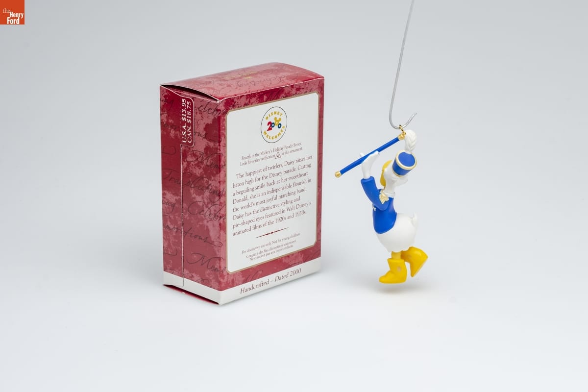 DISNEY / 2000 / WELCOMES / Fourth in the Mickey's Holiday Parade Series. / Look for series verification 4 on this ornament. / The happiest of twirlers, Daisy raises her / baton high for the Disney parade. Casting / a beguiling smile back at her sweetheart / Donald, she is an indispensable flourish in / the world's most joyful marching band. / Daisy has the distinctive styling and / pie-shaped eyes featured in Walt Disney's / animated films of the 1920s and 1930s./ For decorative use only. Not for young children. / Concue a des fins decoratives seulement. / Ne convient pas aux jeunes enfants. / Handcrafted - Dated 2000