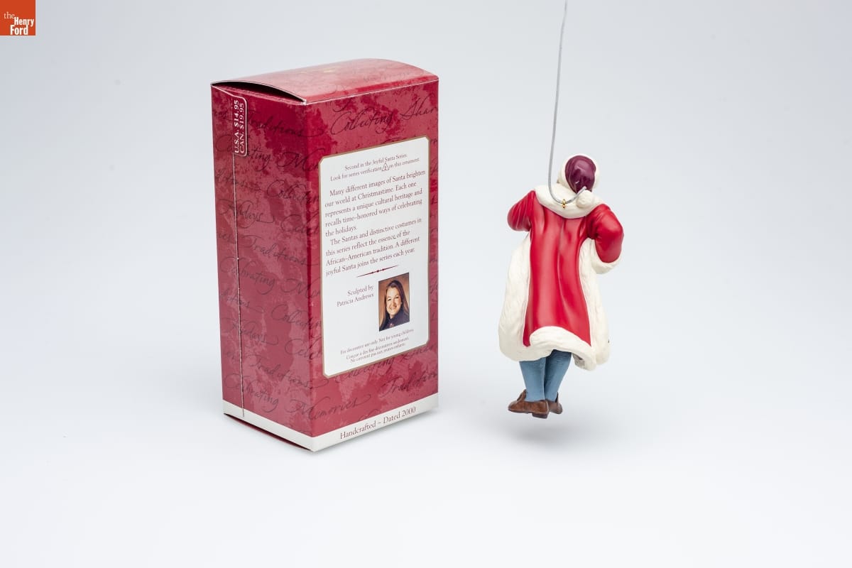 Second in the Joyful Santa Series. / Look for series verification 2 on this ornament. / Many different images of Santa brighten / our world at Christmastime. Each one / represents a unique cultural heritage and / recalls time-honored ways of celebrating / the holidays. / The Santas and distinctive costumes in / this series reflect the essence of the / African-American tradition. A different / joyful Santa joins the series each year. / Sculpted by / Patricia Andrews / For decorative use only. Not for young children. / Concue a des fins decoratives seulement. / Ne convient pas aux jeunes enfants. / Handcrafted - Dated 2000