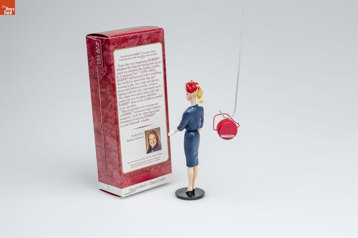 Seventh in the BARBIE Ornament Series. / Look for series verification 7 on this ornament. / From the very beginning, BARBIE / delighted her fans by having tiny acces- / sories to complete her fashion outfits. / In Commuter Set (1959-1960), / BARBIE doll arrived with everything / she needed to spend the day and / evening in the city: a hat and gloves, / shoes, and fashion jewelry--even a / hatbox with her very own name on it. / The classic two-piece navy suit was / perfect for any occasion, whether / BARBIE chose to be a fashion model / or an executive. / This set includes two ornaments: / a BARBIE ornament and a hatbox / ornament. Look for other Keepsake / Ornaments featuring BARBIE / at your Hallmark retailer. / Sculpted by / Patricia Andrews / For decorative use only. Not for young children. / Concue a des fins decoratives seulement. / Ne convient pas aux jeunes enfants. / Handcrafted - Dated 2000