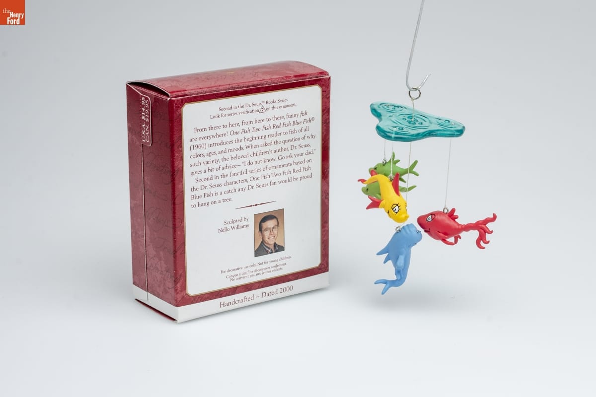 Second in the Dr. Seuss Books Series. / Look for series verification 2 on this ornament. / From there to here, from here to there, funny fish / are everywhere! / One Fish Two Fish Red Fish Blue Fish / (1960) introduces the beginning reader to fish of all / colors, ages, and moods. When asked the question of why / such variety, the beloved children's author, Dr. Seuss, / gives a bit of advice--"I do not know. Go ask your dad." / Second in the fanciful series of ornaments based on / the Dr. Seuss characters, One Fist Two Fish Red Fish / Blue Fish is a catch any Dr. Seuss fan would be proud to hang on a tree. / Sculpted by / Nello Williams / For decorative use only. Not for young children. / Concue a des fins decoratives seulement. / Ne convient pas aux jeunes enfants. / Handcrafted - Dated 2000
