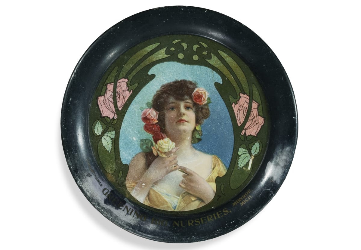 The Art Nouveau style reached its peak of popularity in 1900, but American manufacturers continued to use echoes of it in the years to come. The Art Nouveau design of this tray, produced in Ohio for a Michigan nursery company, would have appealed to many middle-class consumers.