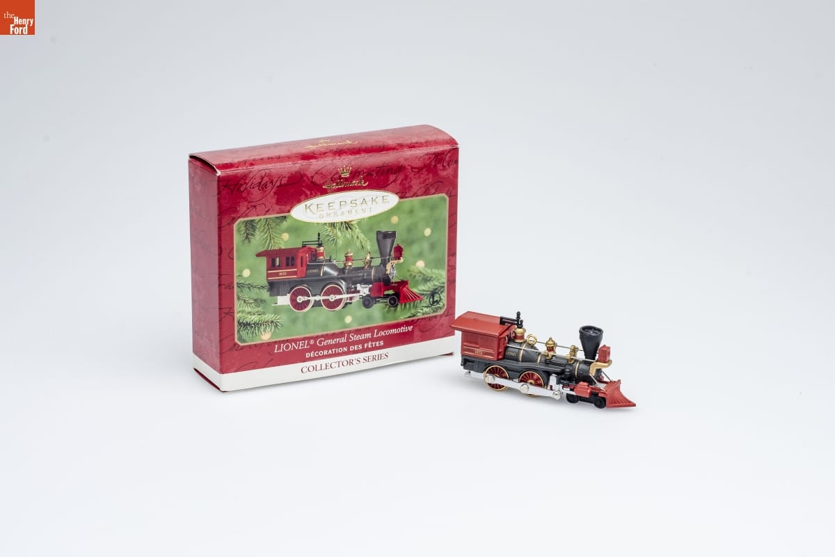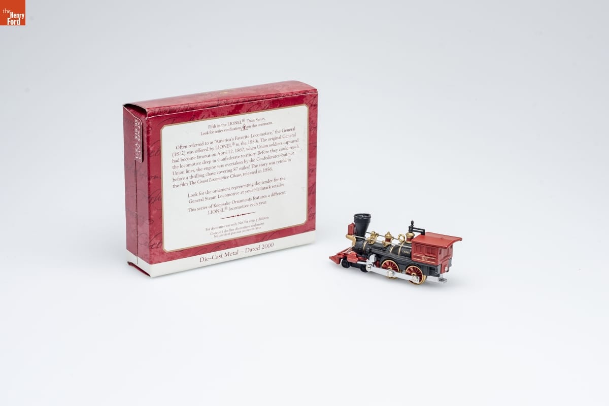 Fifth in the LIONEL Train Series. / Look for series verification 5 on this ornament. / Often referred to as "America's Favorite Locomotive," the General / (1872) was offered by LIONEL in the 1950s. The original General / had become famous on April 12, 1862, when UNION soldiers captured / the locomotive deep in Confederate territory. Before they could reach / Union lines, the engine was overtaken by the Confederates--but not / before a thrilling chase covering 87 miles! The story was retold in / the film The Great Locomotive Chase, released in 1956. / Look for the ornament representing the tender for the / General Steam Locomotive at your Hallmark retailer. / This series of Keepsake Ornaments features a different / LIONEL locomotive each year. / For decorative use only. Not for young children. / Concue a des fins decoratives seulement. / Ne convient pas aux jeunes enfants. / Die-Cast Metal - Dated 2000