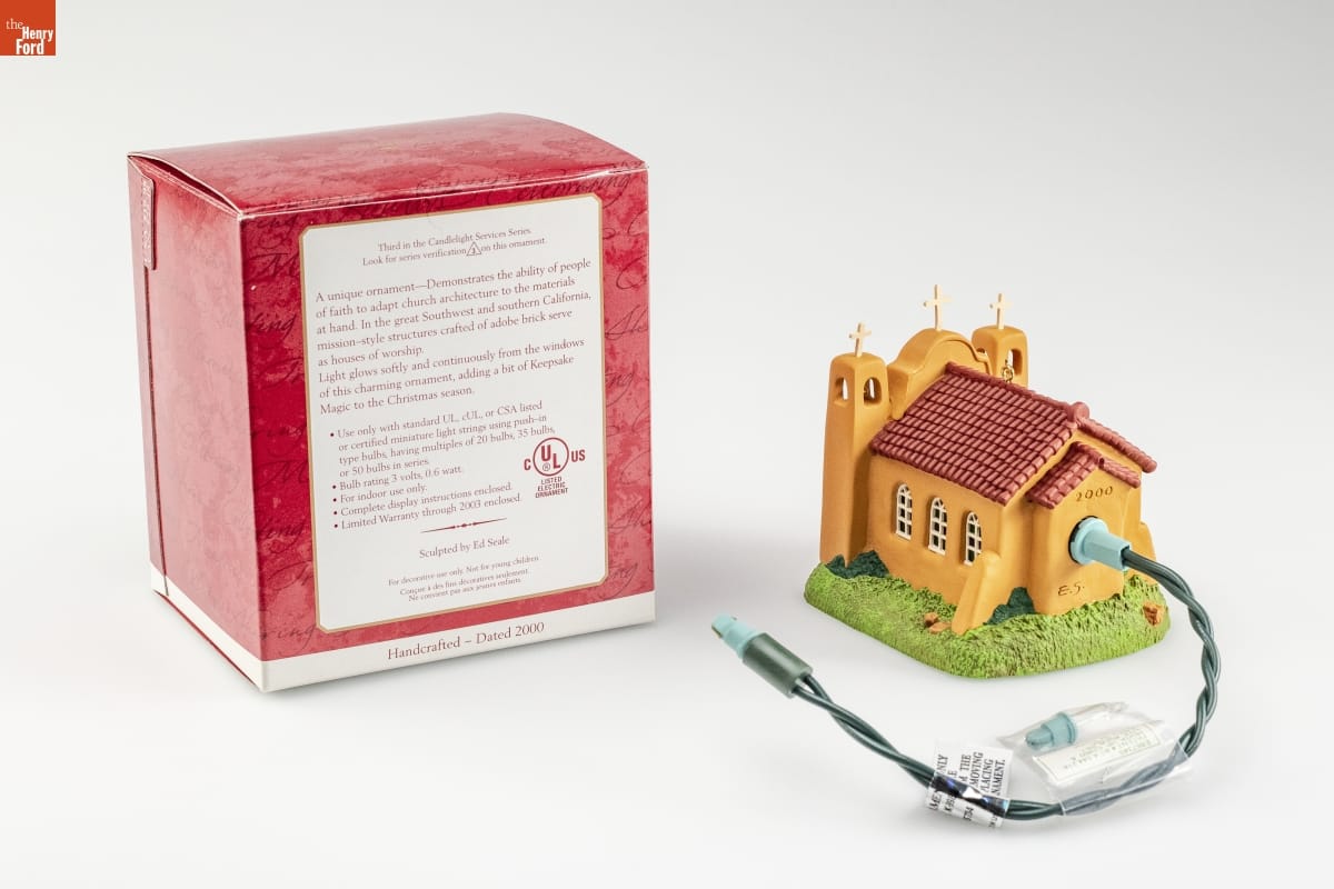 Third in the Candlelight Services Greetings Series. / Look for series verification 3 on this ornament. / A unique ornament - Demonstrates the ability of people / of faith to adapt church architecture to the materials / at hand. In the great Southwest and southern California, / mission-style structures crafted of adobe brick serve / as houses of worship. / Light glows softly and continuously from the windows / of this charming ornament, adding a bit of Keepsake / magic to the Christmas season. / Use only with standard UL, cUL, or CSA listed / or certified miniature light strings using push-in / type bulbs, having multiples of 35 bulbs / or 50 bulbs in series. / Bulb rating 3 volts, 0.6 watts. / For indoor use only. / Complete display instructions enclosed. / Limited Warranty through 2003 enclosed. / Sculpted by Ed Seale / For decorative use only. Not for young children. / Concue a des fins decoratives seulement. / Ne convient pas aux jeunes enfants. / Handcrafted - Dated 2000