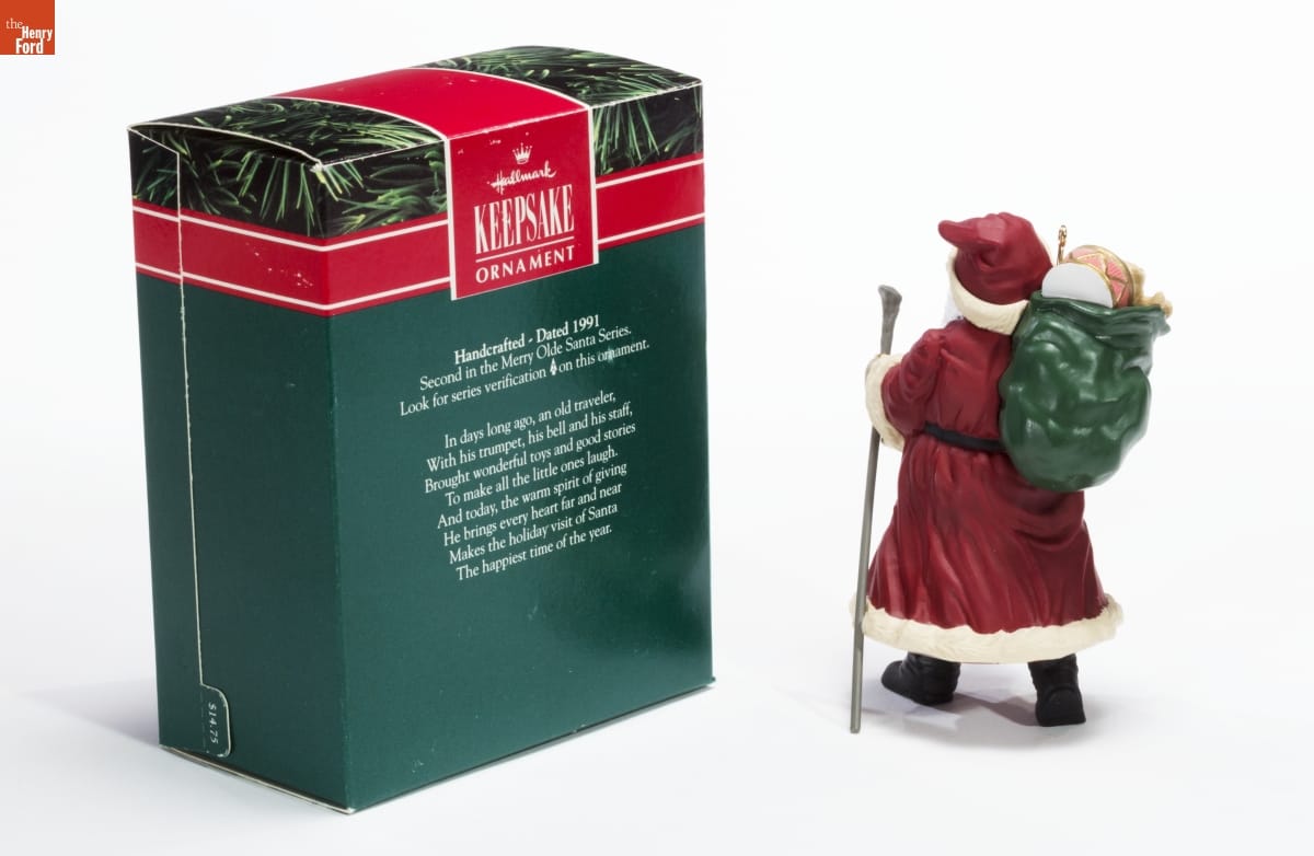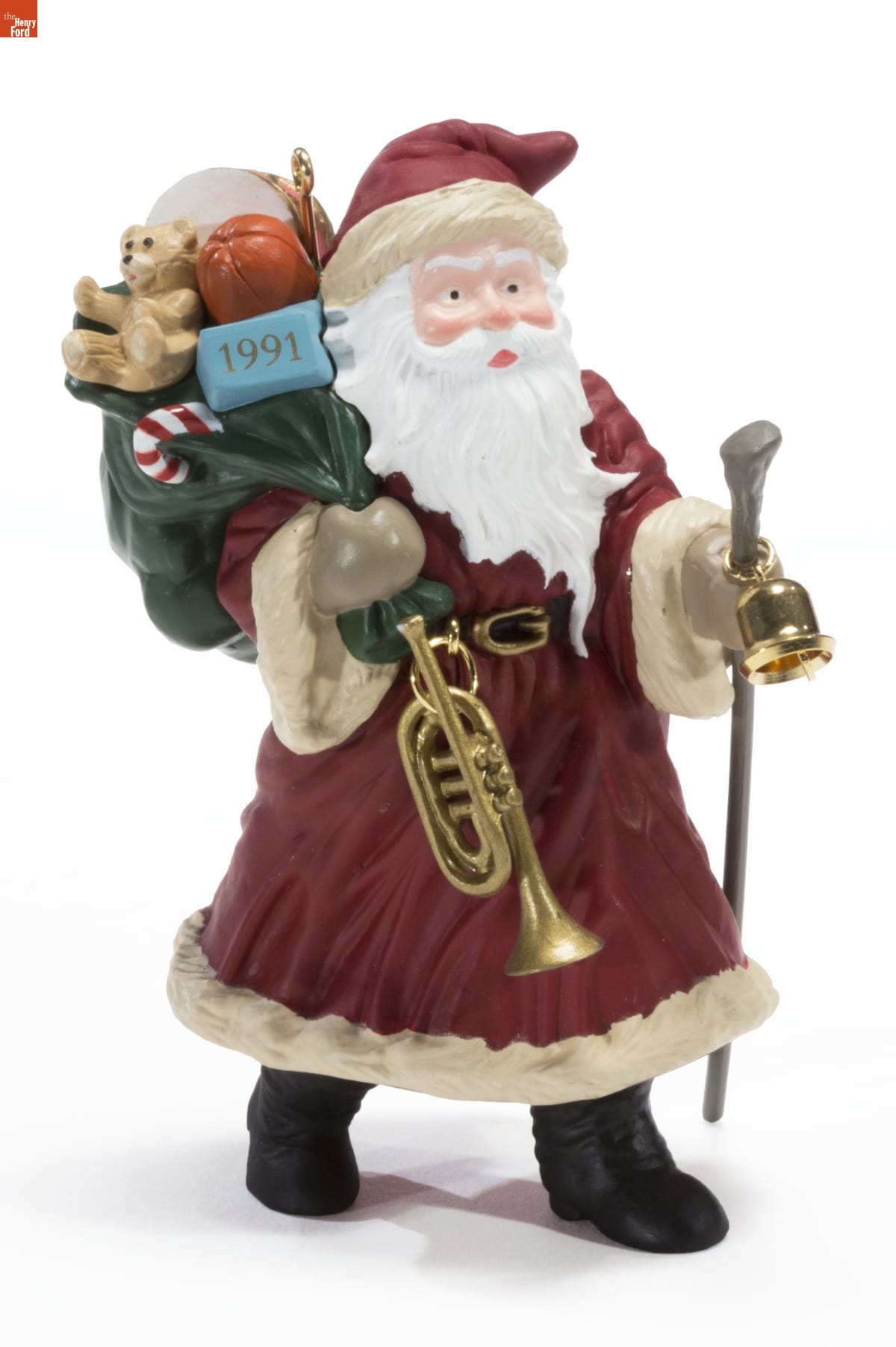 Hallmark / KEEPSAKE / ORNAMENT / Handcrafted - Dated 1991 / Second in the Merry Olde Santa Series. / Look for series verification 2 on this ornament. / In days long ago, an old traveler, / With his trumpet, his bell and his staff, / Brought wonderful toys and good stories / To make all the little ones laugh. / And today, the warm spirit of giving / He brings every heart far and near / Makes the holiday visit of Santa / The happiest time of the year.
