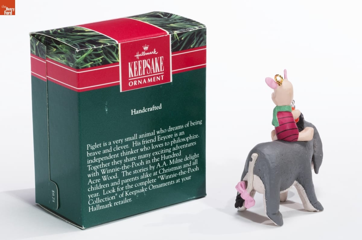 Hallmark / KEEPSAKE / ORNAMENT / Handcrafted / Piglet is a very small animal who dreams of being / brave and clever. His friend Eeyore is an / independent thinker who loves to philosophize. / Together they share many exciting adventures / with Winnie-the-Pooh in the Hundred / Acre Wood. The stories by A.A. Milne delight / children and parents alike at Christmas and all / year. Look for the complete "Winnie-the-Pooh / Collection" of Keepsake Ornaments at your / Hallmark retailer.