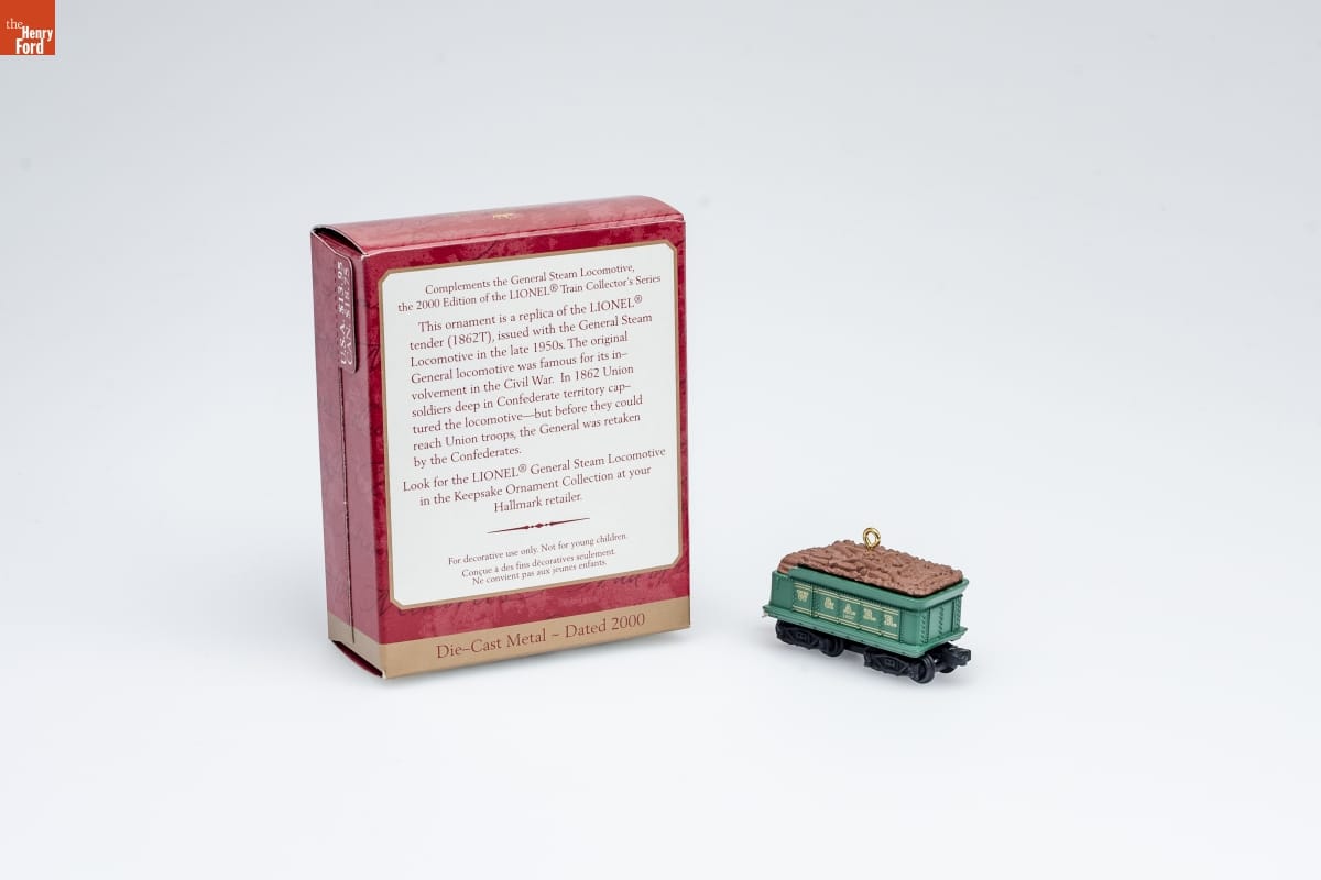 Complements the General Steam Locomotive, / the 2000 Edition of the LIONEL Train Collector's Series / This ornament is a replica of the LIONEL / tender (1862T), issued with the General Steam / Locomotive in the late 1950s. The original / General locomotive was famous for its in- / volvement in the Civil War. In 1862 Union / soldiers deep in Confederate territory cap- / tured the locomotive--but before they could / reach Union troops, the General was retaken / by the Confederates. / Look for the LIONEL General Steam Locomotive / in the Keepsake Ornament Collection at your / Hallmark retailer. / For decorative use only. Not for young children. / Concue a des fins decoratives seulement. / Ne convient pas aux jeunes enfants. / Die-Cast Metal - Dated 2000