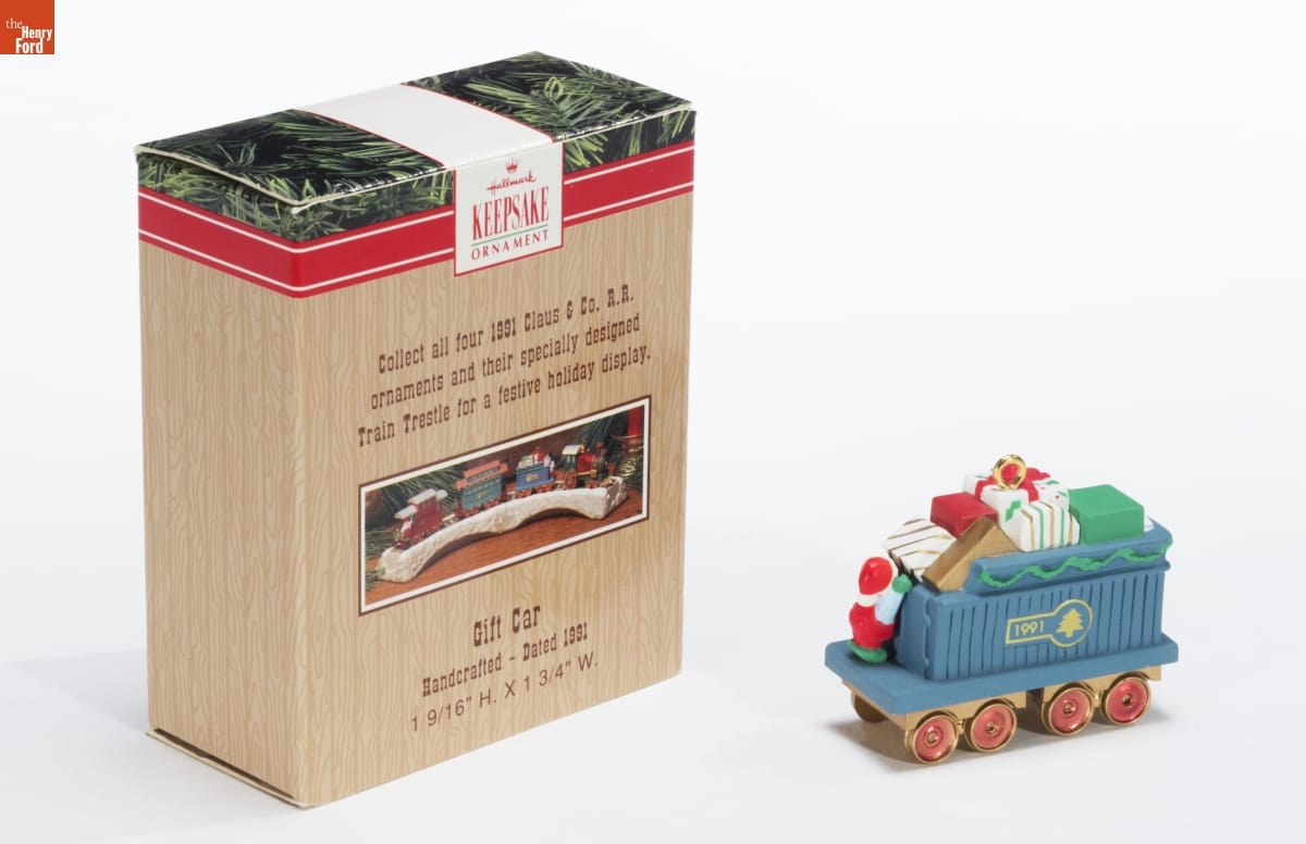 Hallmark / KEEPSAKE / ORNAMENT / Collect all four 1991 Claus & Co. R.R. / ornaments and their specially designed / Train Trestle for a festive holiday display. / Gift Car / Handcrafted - Dated 1991 / 1 9/16" H. X 1 3/4" W.