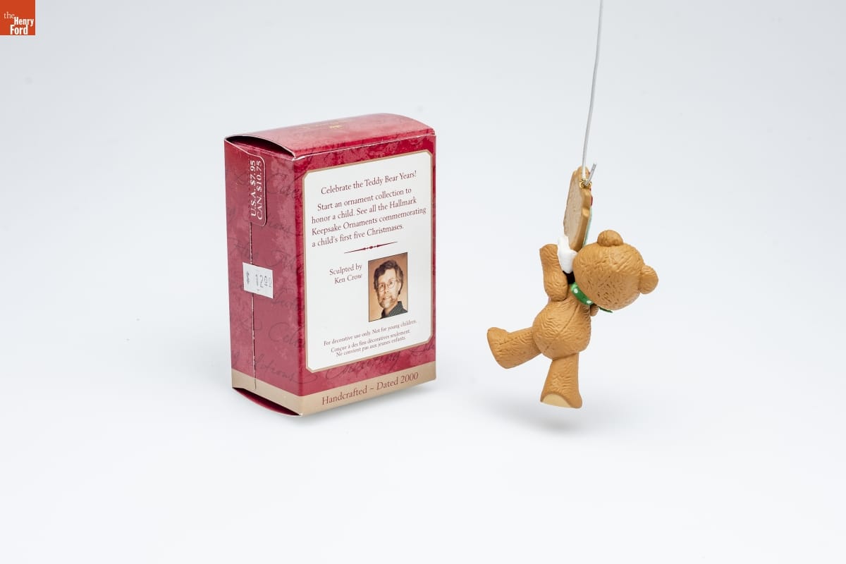 Celebrate the Teddy Bear Years! / Start an ornament collection to / honor a child. See all the Hallmark / Keepsake Ornaments commemorating / a child's first five Christmases. / Sculpted by / Ken Crow / For decorative use only. Not for young children. / Concue a des fins decoratives seulement. / Ne convient pas aux jeunes enfants. / Handcrafted - Dated 2000
