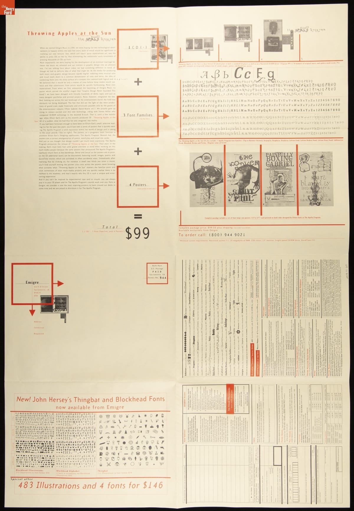 Emigre is a digital type foundry established by Rudy VanderLans and Zuzana Licko. The company's history is linked with the introduction of the 1984 Macintosh computer, used to design their early bitmapped typefaces. Emigre's digital work gained notoriety -- defying visual communication standards with fractured, layered combinations of text and image. This item advertised fonts or other items available for purchase.