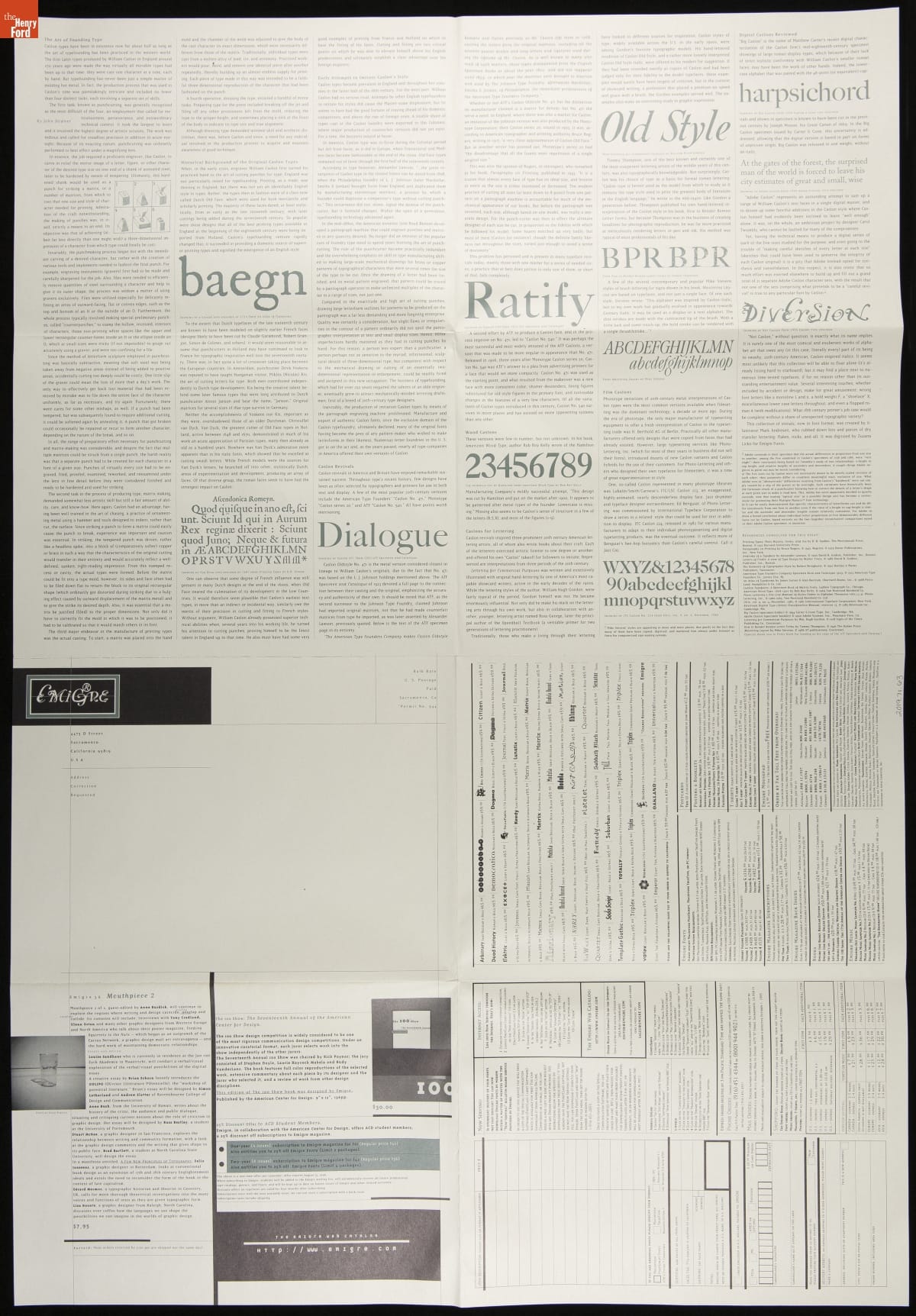 Emigre is a digital type foundry established by Rudy VanderLans and Zuzana Licko. The company's history is linked with the introduction of the 1984 Macintosh computer, used to design their early bitmapped typefaces. Emigre's digital work gained notoriety -- defying visual communication standards with fractured, layered combinations of text and image. This item advertised fonts or other items available for purchase.