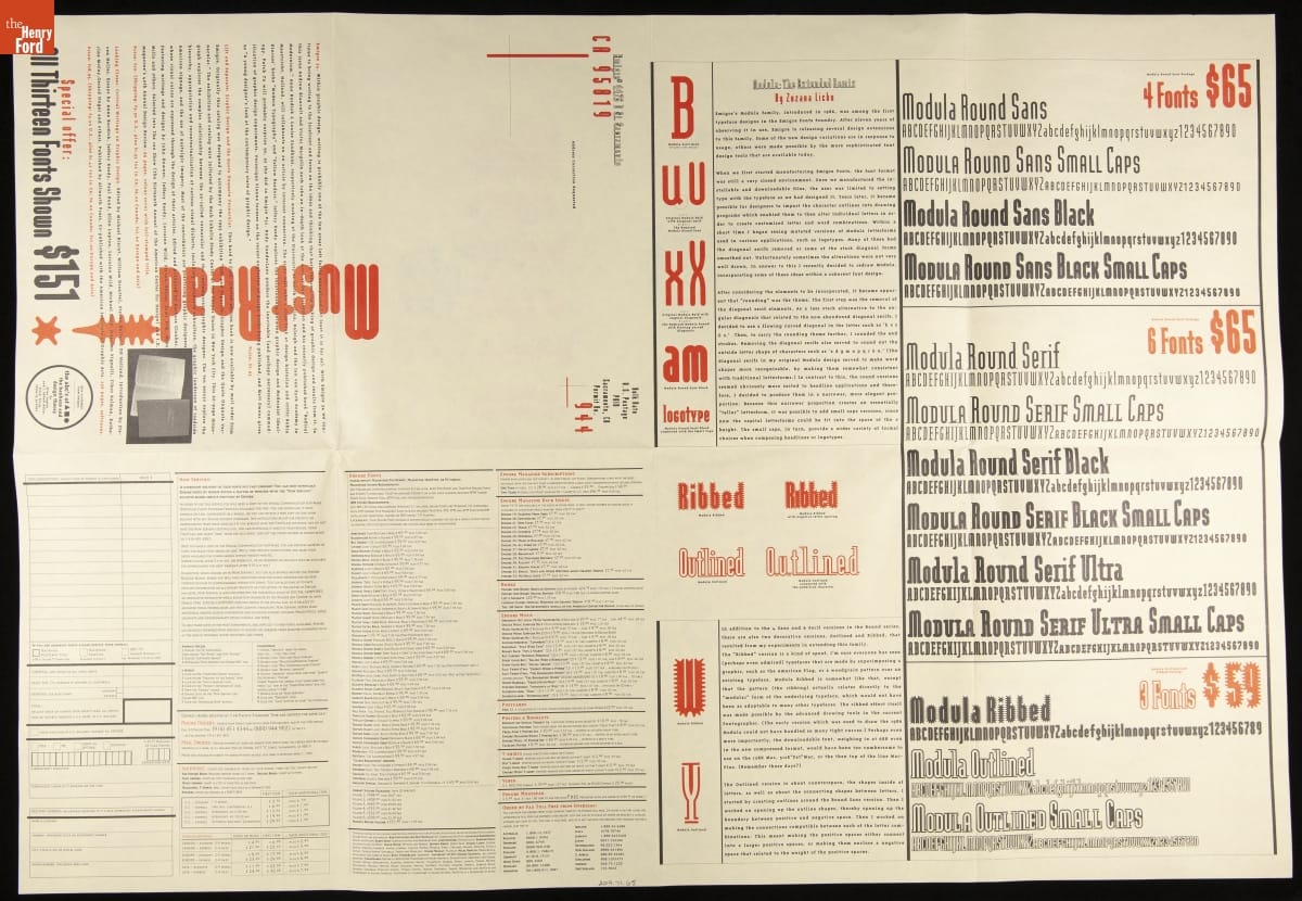 Emigre is a digital type foundry established by Rudy VanderLans and Zuzana Licko. The company's history is linked with the introduction of the 1984 Macintosh computer, used to design their early bitmapped typefaces. Emigre's digital work gained notoriety -- defying visual communication standards with fractured, layered combinations of text and image. This item advertised fonts or other items available for purchase.