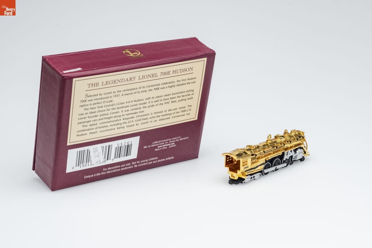 THE LEGENDARY LIONEL 700E HUDSON / Selected by Lionel as the centerpiece of its Centennial celebration, the first Hudson / 700E was introduced in 1937. A marvel of its time, the 700E was a highly detailed die-cast / replica in perfect O scale. / The New York Central's J-Class 4-6-4 Hudson, with its classic steam locomotive styling, / was an ideal choice for the landmark Lionel model. It is said to have been the favorite of / Lionel founder Joshua Cowen. It was certainly the pride of the NYC fleet, pulling both / passenger cars and freight along its namesake river. / This dated, commemorative Keepsake Ornament is formed of die-cast metal. The / combination of finishes, including the 22 K. Gold Flash, echo the markings of the 700E J-1E Hudson Steam Locomotive being issue by Lionel in an elaborate Centennial set. / LIONEL (R) Licensed by Lionel L.L.C. / Mfd. for Hallmark Cards, Inc., Kansas City, MO 64141 / www.hallmark.com / Made in China QXI5261 / For decorative use only. Not for young children / Concue a des fins decoratives seulement. Ne convient pas aux jeunes enfants.
