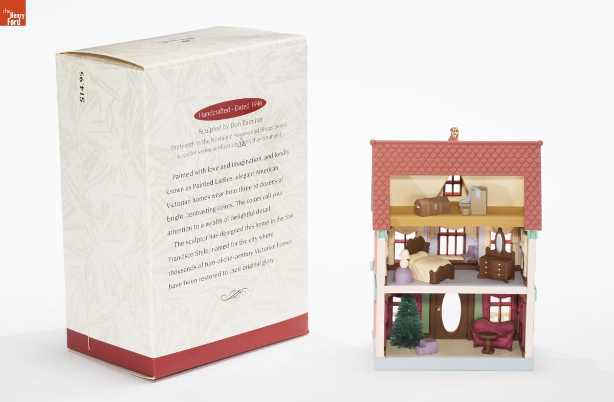 Handcrafted - Dated 1996 / Sculpted by Don Palmiter / Thirteenth in the Nostalgic Houses and Shops Series / Look for series verification 13 on this ornament / Painted with love and imagination, and fondly / known as Painted Ladies, elegant American / Victorian homes wear from three to dozens of / bright, contrasting colors. The colors call your / attention to a wealth of delightful detail. / The sculptor has designed this home in the San / Francisco Style, named for the city where / thousands of turn-of-the-century Victorian homes / have been restored to their original glory.